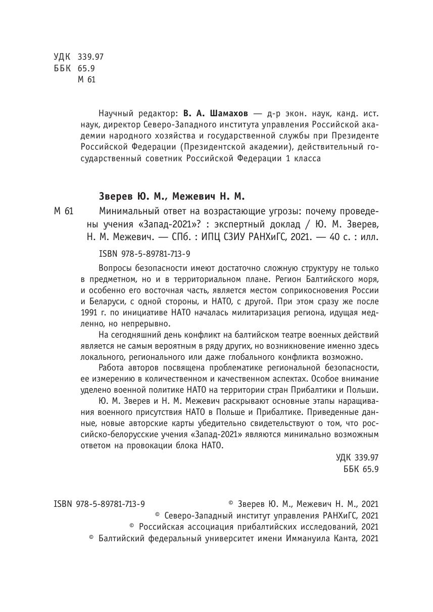 Вопросы безопасности имеют достаточно сложную структуру не только в предметном, но и в территориальном плане. Регион Балтийского моря, и особенно его восточная часть, является местом соприкосновения России и Беларуси, с одной стороны, и НАТО, с другой. При этом сразу же после 1991 г. по инициативе НАТО началась милитаризация региона, идущая медленно, но непрерывно. На сегодняшний день конфликт на балтийском театре военных действий является не самым вероятным в ряду других, но возникновение именно здесь локального, регионального или даже глобального конфликта возможно. Работа авторов посвящена проблематике региональной безопасности, ее измерению в количественном и качественном аспектах. Особое внимание уделено военной политике НАТО на территории стран Прибалтики и Польши. Ю. М. Зверев и Н. М. Межевич раскрывают основные этапы наращивания военного присутствия НАТО в Польше и Прибалтике. Приведенные данные, новые авторские карты убедительно свидетельствуют о том, что российско-белорусские учения «Запад-2021» являются минимально возможным ответом на провокации блока НАТО.