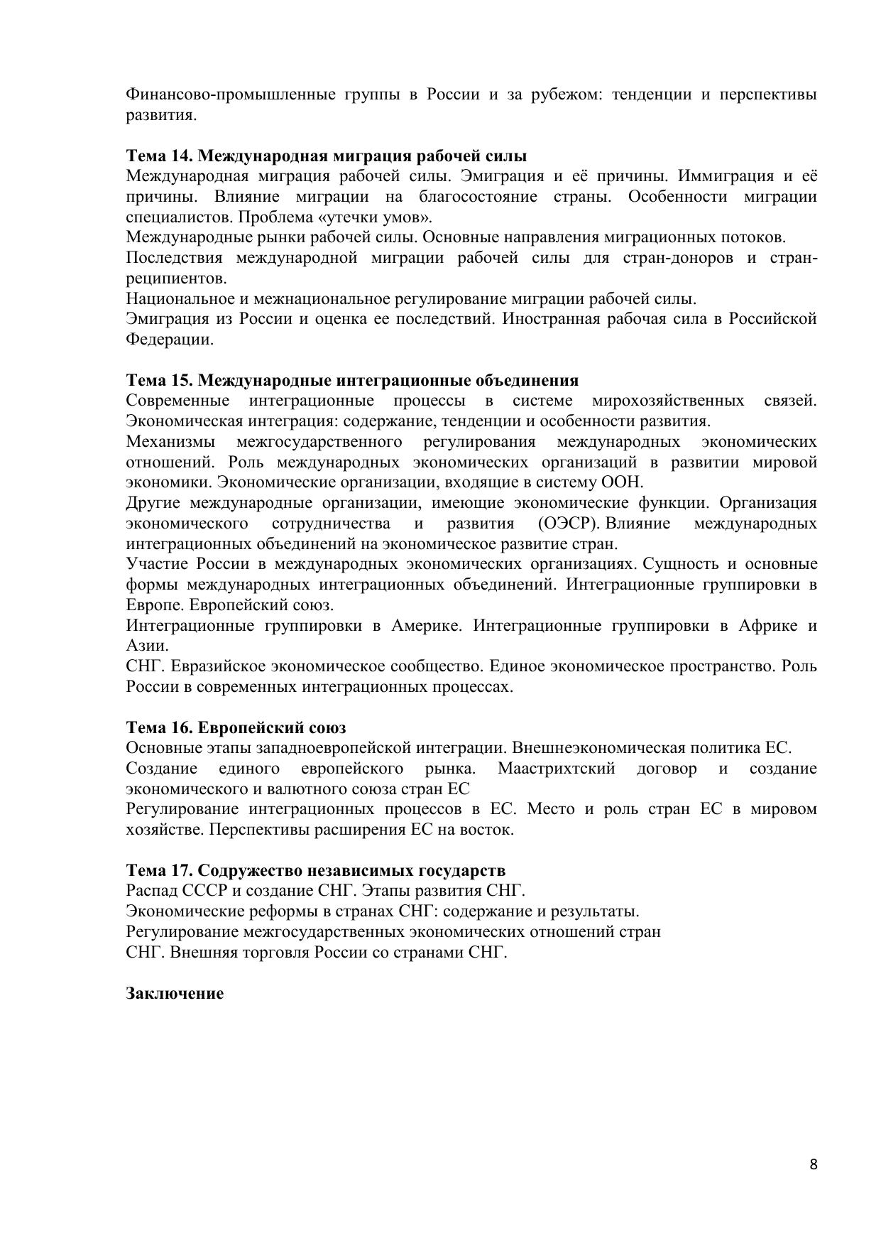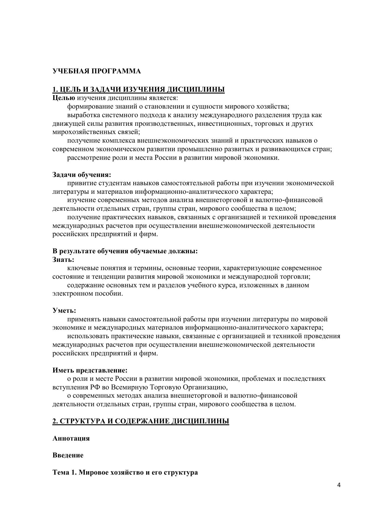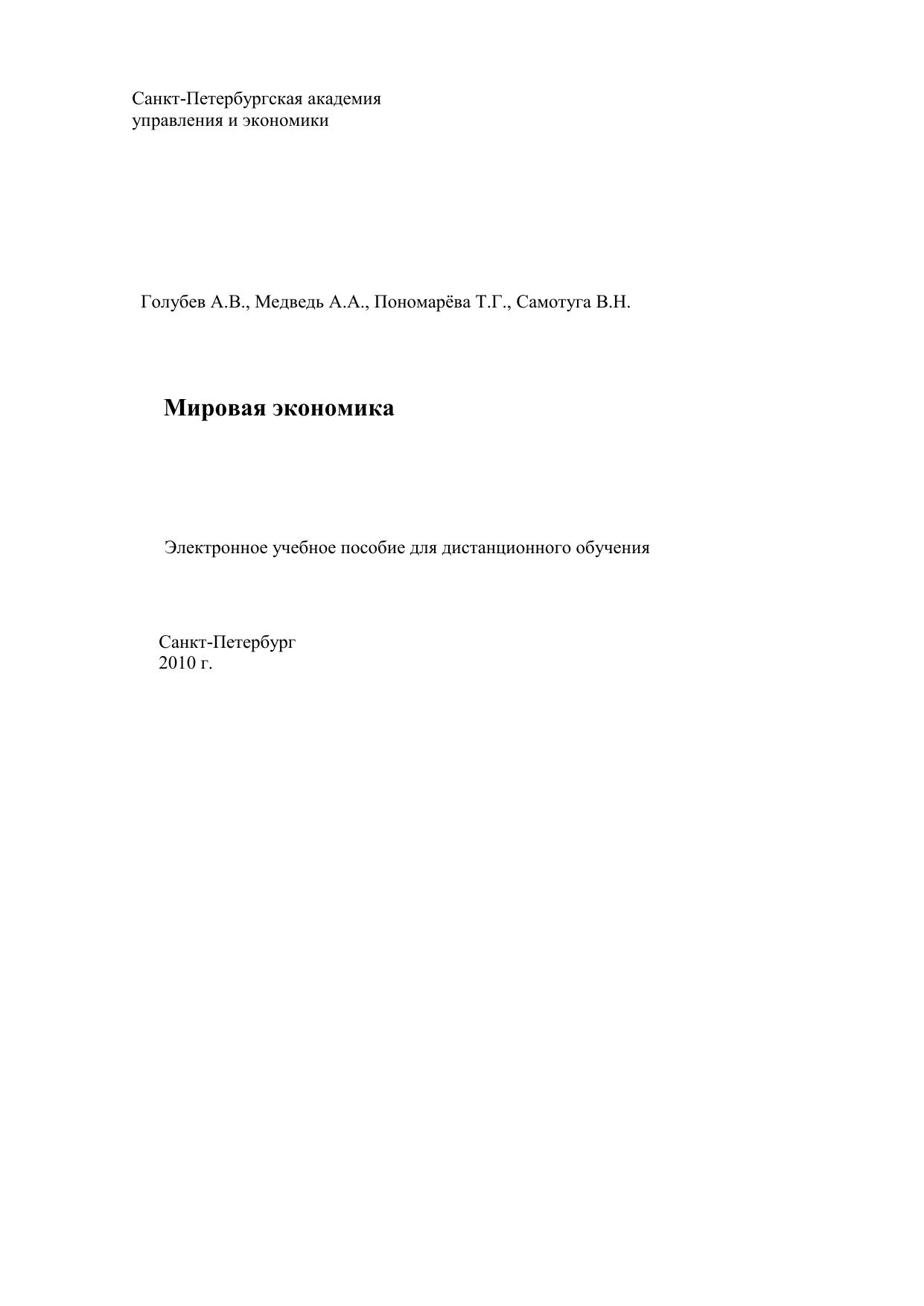 Электронное учебное пособие по дисциплине «Мировая экономика», содержит программу курса, вопросы к семинарским занятиям, методические рекомендации по написанию курсовых и контрольных работ, примерный перечень тем курсовых и контрольных работ, вопросов к зачету и экзамену, тестовые задания. Электронное учебное пособие предназначено для студентов дистанционной формы обучения, обучающихся в Академии управления и экономики. Пособие соответствует государственному образовательному стандарту высшего, профессионального образования для специальности: «Менеджмент организаций». Электронное учебное пособие для дистанционного обучения