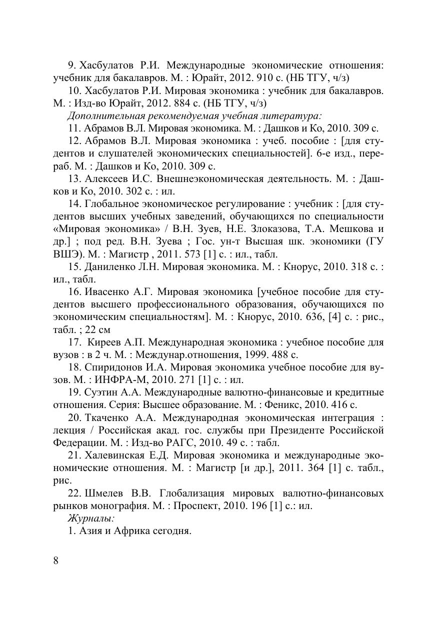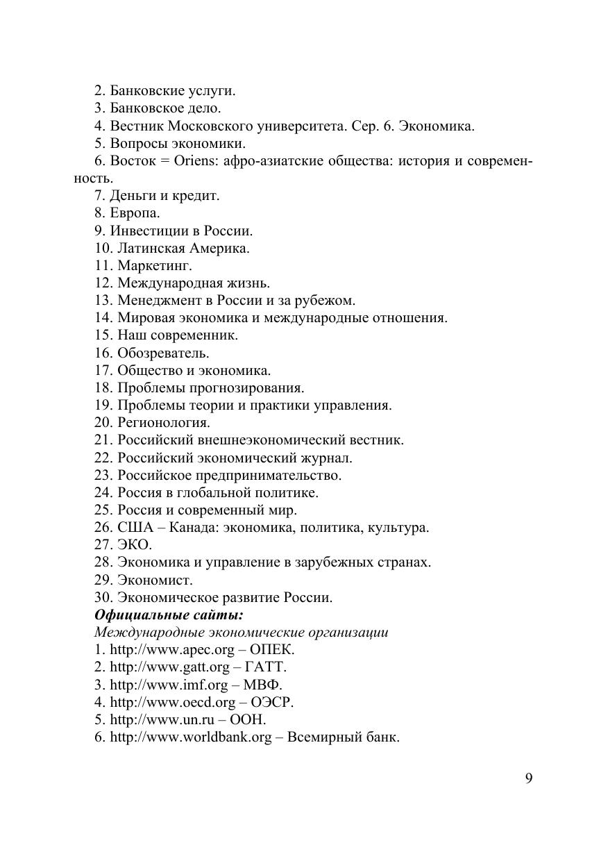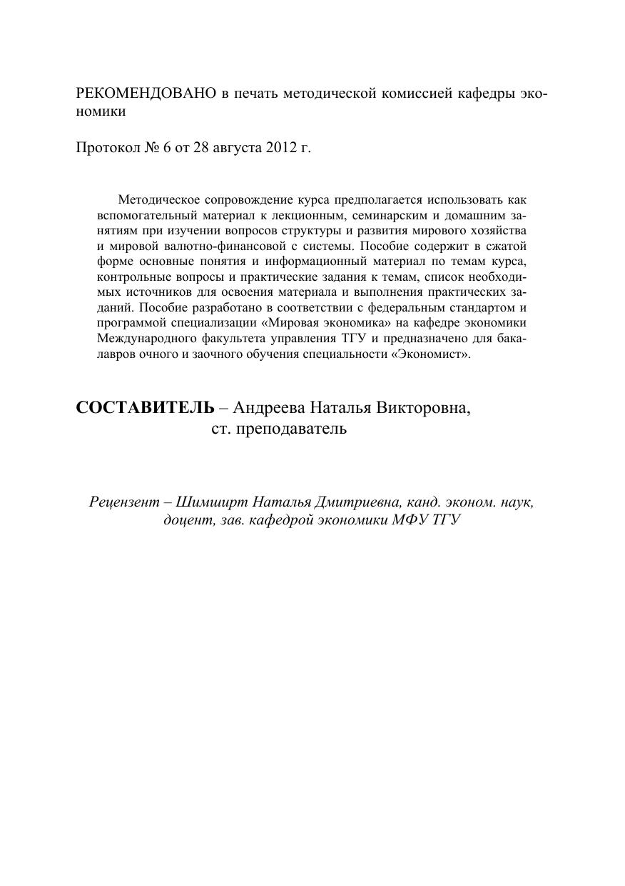 Методическое сопровождение курса предполагается использовать как вспомогательный материал к лекционным, семинарским и домашним занятиям при изучении вопросов структуры и развития мирового хозяйства и мировой валютно-финансовой с системы. Пособие содержит в сжатой форме основные понятия и информационный материал по темам курса, контрольные вопросы и практические задания к темам, список необходимых источников для освоения материала и выполнения практических заданий. Пособие разработано в соответствии с федеральным стандартом и программой специализации «Мировая экономика» на кафедре экономики Международного факультета управления ТГУ и предназначено для бакалавров очного и заочного обучения специальности «Экономист».