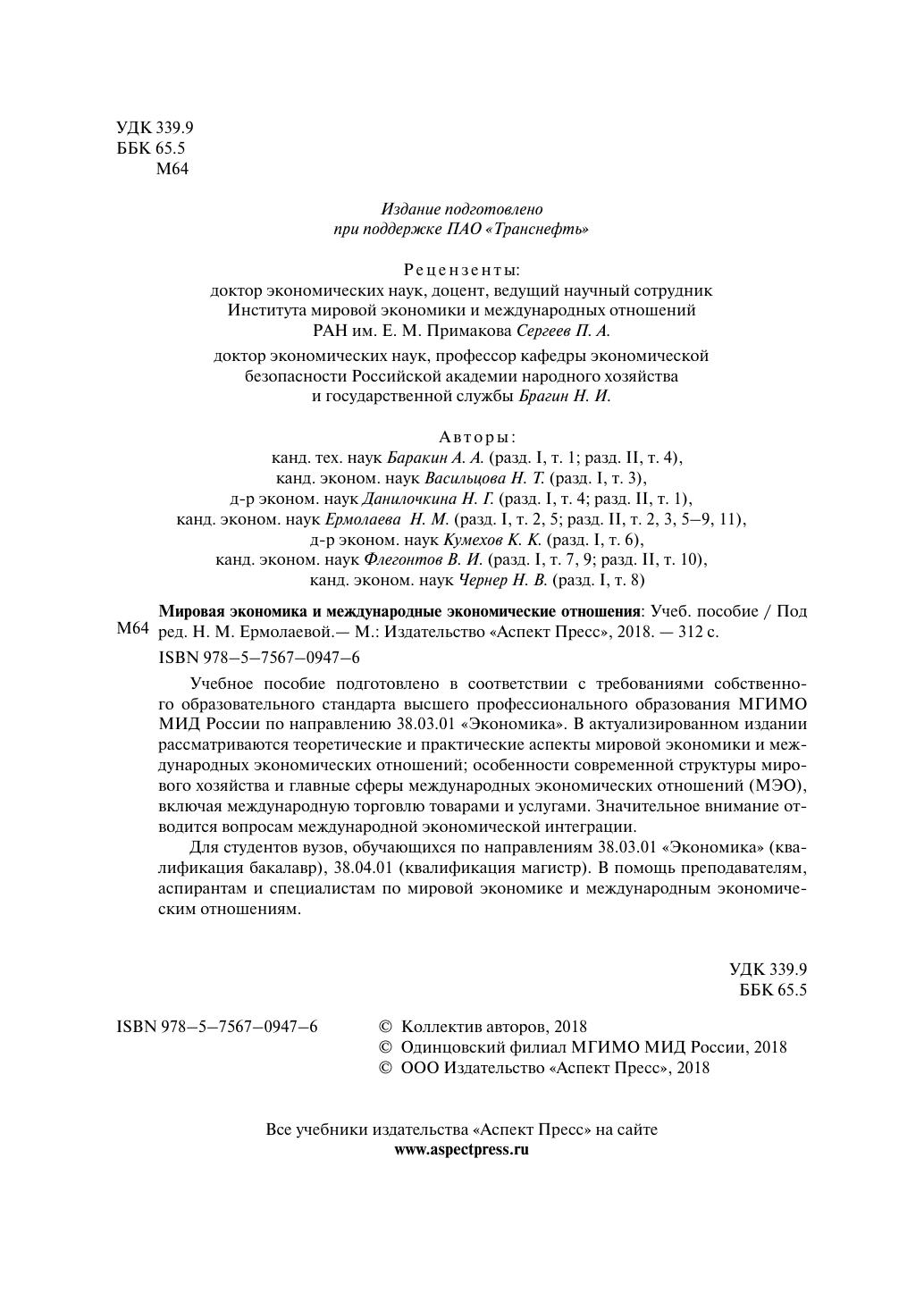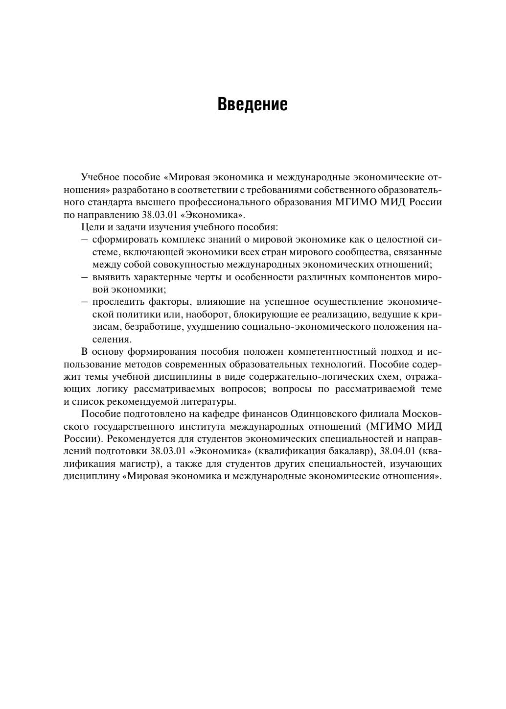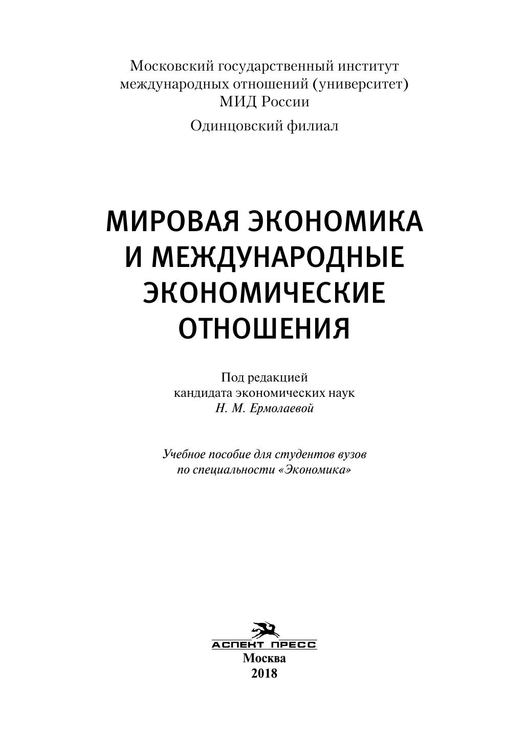 Учебное пособие подготовлено в соответствии с требованиями собственного образовательного стандарта высшего профессионального образования МГИМО МИД России по направлению 38.03.01 «Экономика». В актуализированном издании рассматриваются теоретические и практические аспекты мировой экономики и международных экономических отношений, особенности современной структуры мирового хозяйства и главные сферы международных экономических отношений (МЭО), включая международную торговлю товарами и услугами. Значительное внимание отводится вопросам международной экономической интеграции. Для студентов вузов, обучающихся по направлениям 38.03.01 «Экономика» (квалификация бакалавр), 38.04.01 (квалификация магистр). В помощь преподавателям, аспирантам и специалистам по мировой экономике и международным экономическим отношениям.