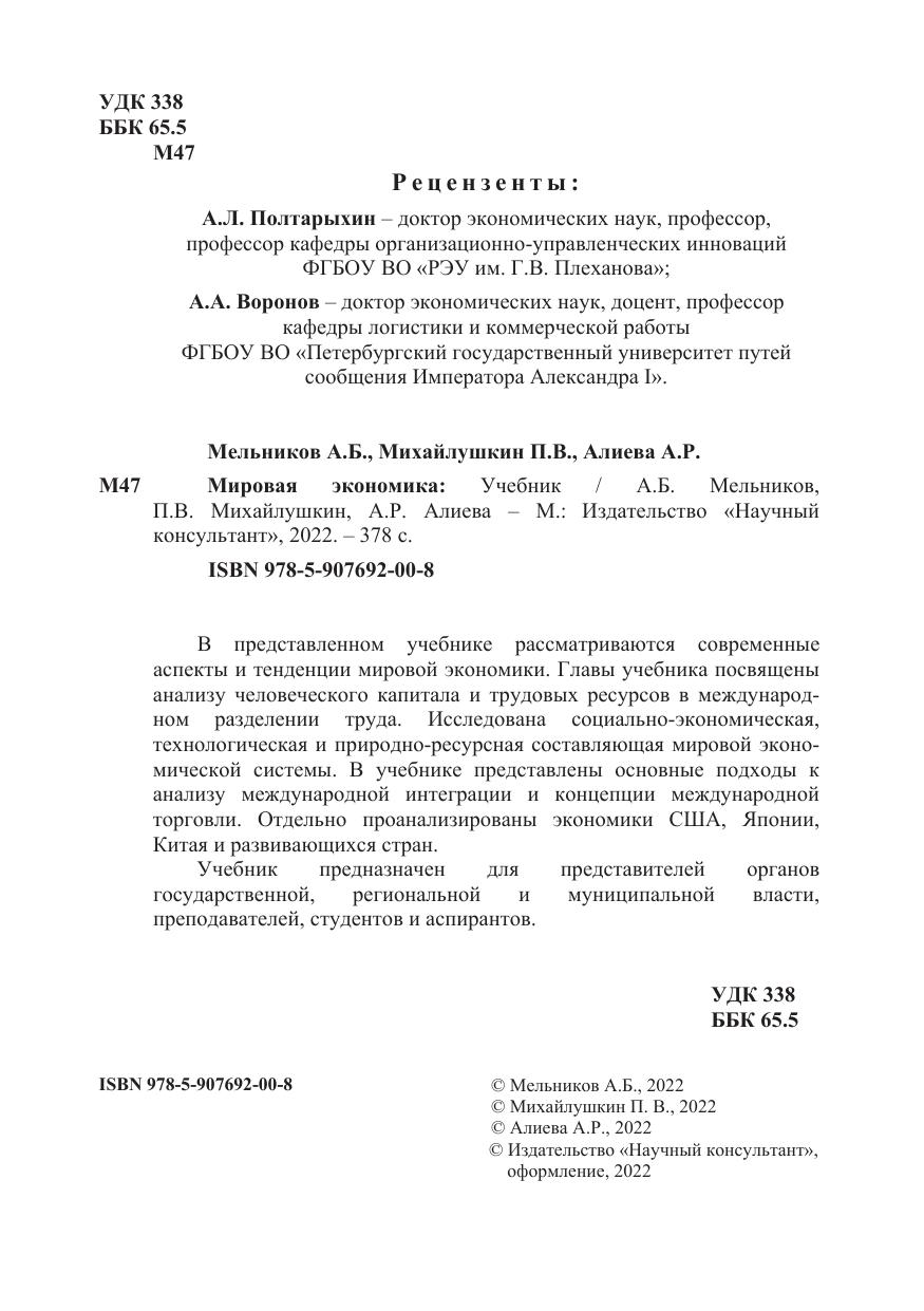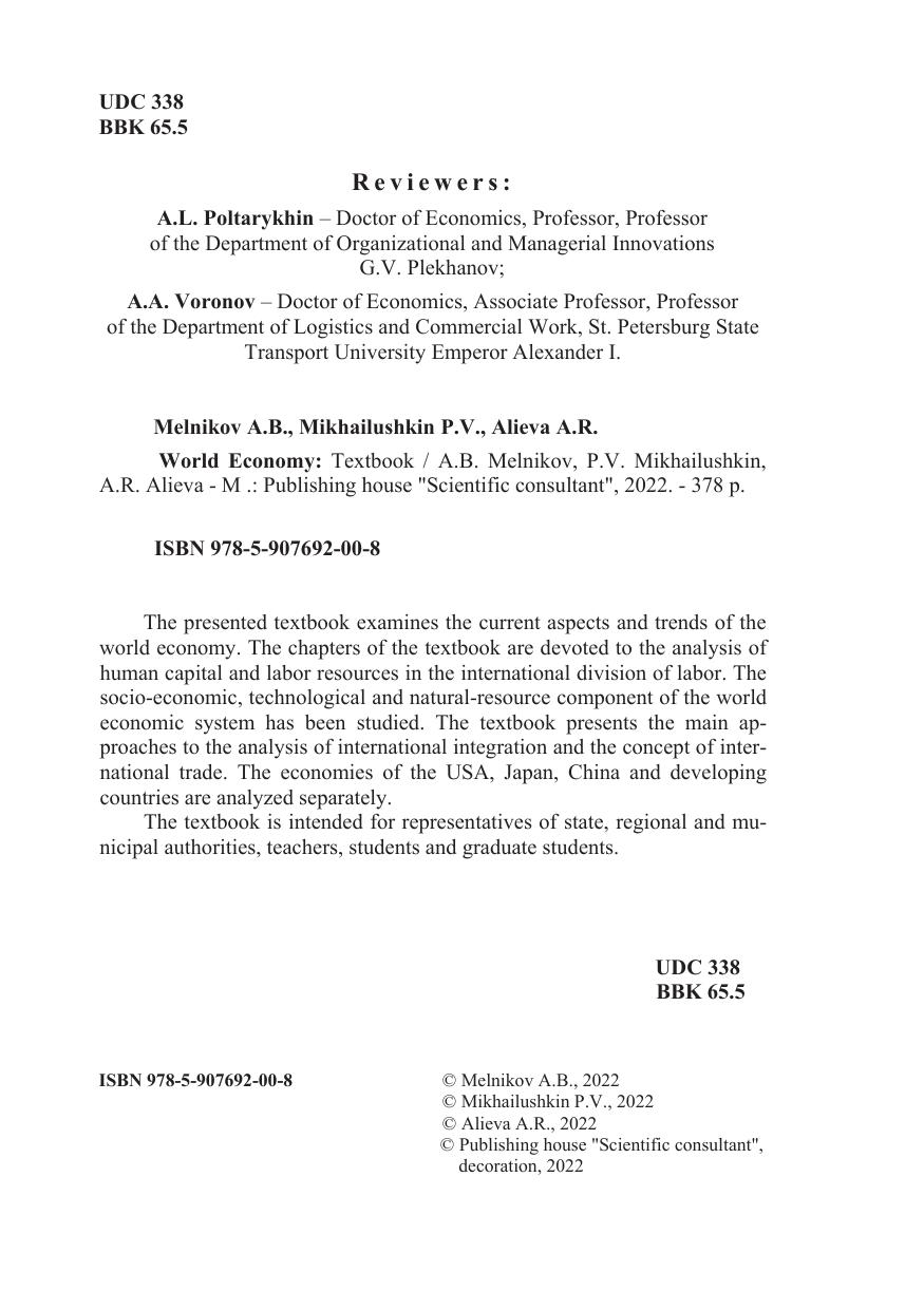 В представленном учебнике рассматриваются современные аспекты и тенденции мировой экономики. Главы учебника посвящены анализу человеческого капитала и трудовых ресурсов в международ-ном разделении труда. Исследована социально-экономическая, технологическая и природно-ресурсная составляющая мировой эконо-мической системы. В учебнике представлены основные подходы к анализу международной интеграции и концепции международной торговли. Отдельно проанализированы экономики США, Японии, Китая и развивающихся стран.