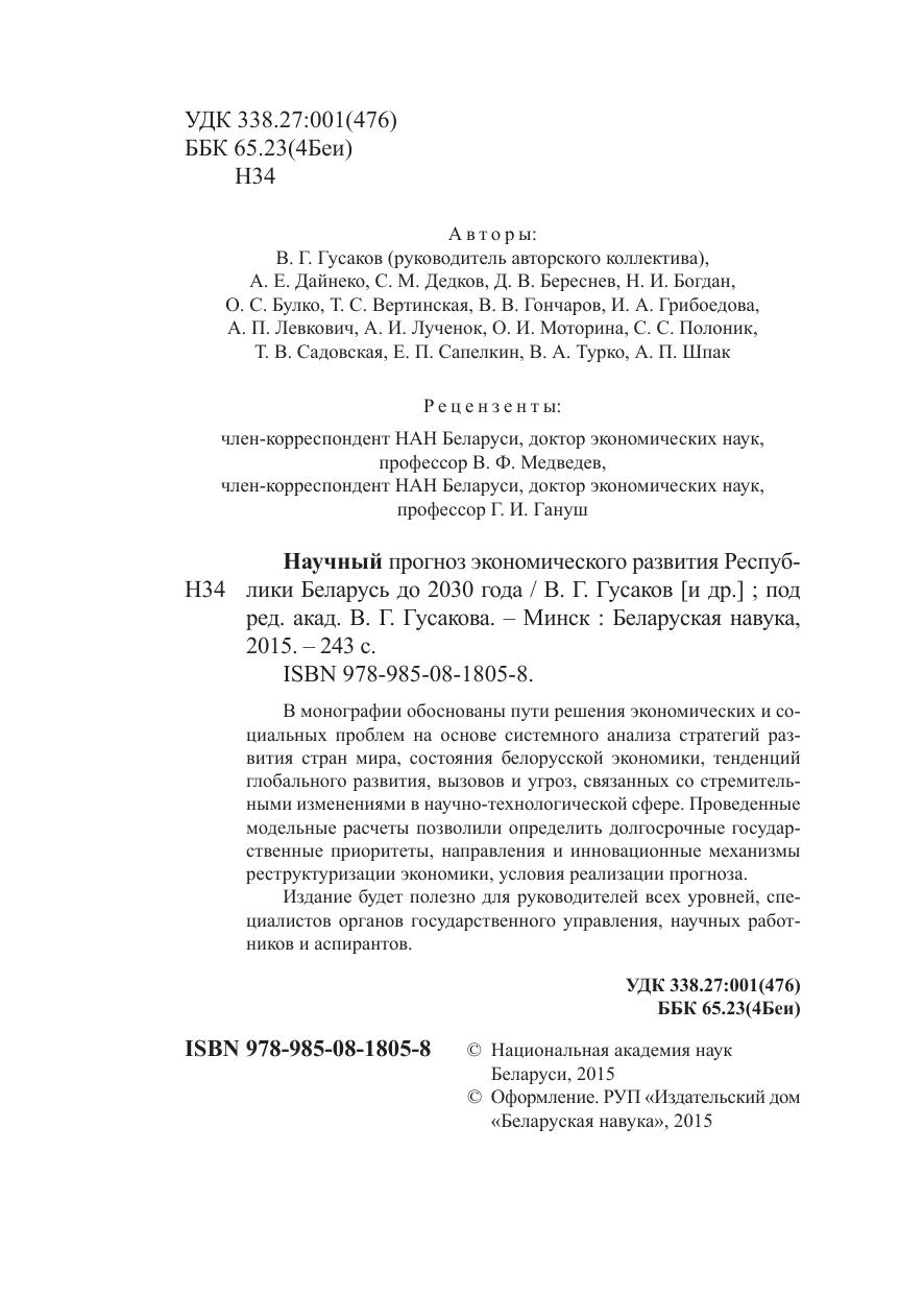 В монографии обоснованы пути решения экономических и социальных проблем на основе системного анализа стратегий развития стран мира, состояния белорусской экономики, тенденций глобального развития, вызовов и угроз, связанных со стремительными изменениями в научно-технологической сфере. Проведенные модельные расчеты позволили определить долгосрочные государственные приоритеты, направления и инновационные механизмы реструктуризации экономики, условия реализации прогноза. Издание будет полезно для руководителей всех уровней, специалистов органов государственного управления, научных работников и аспирантов.