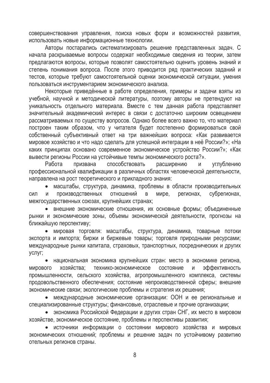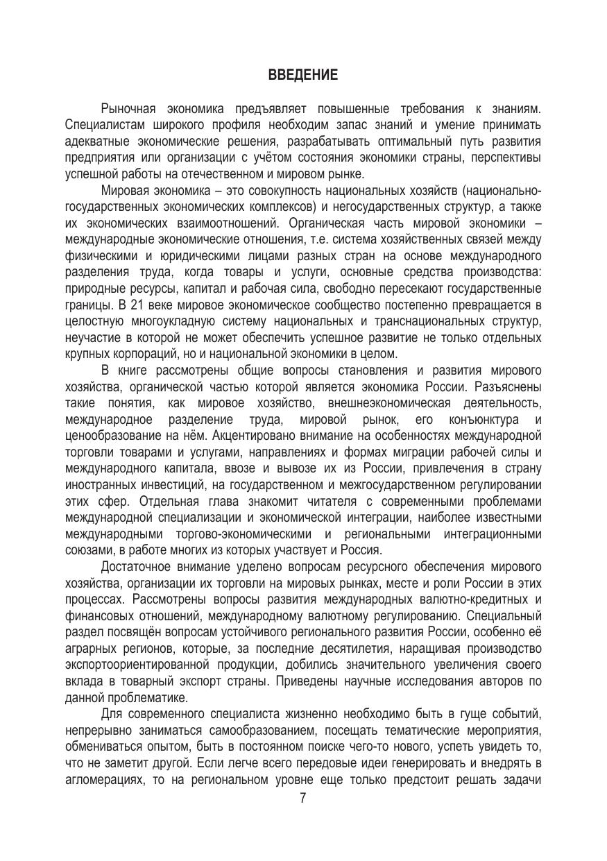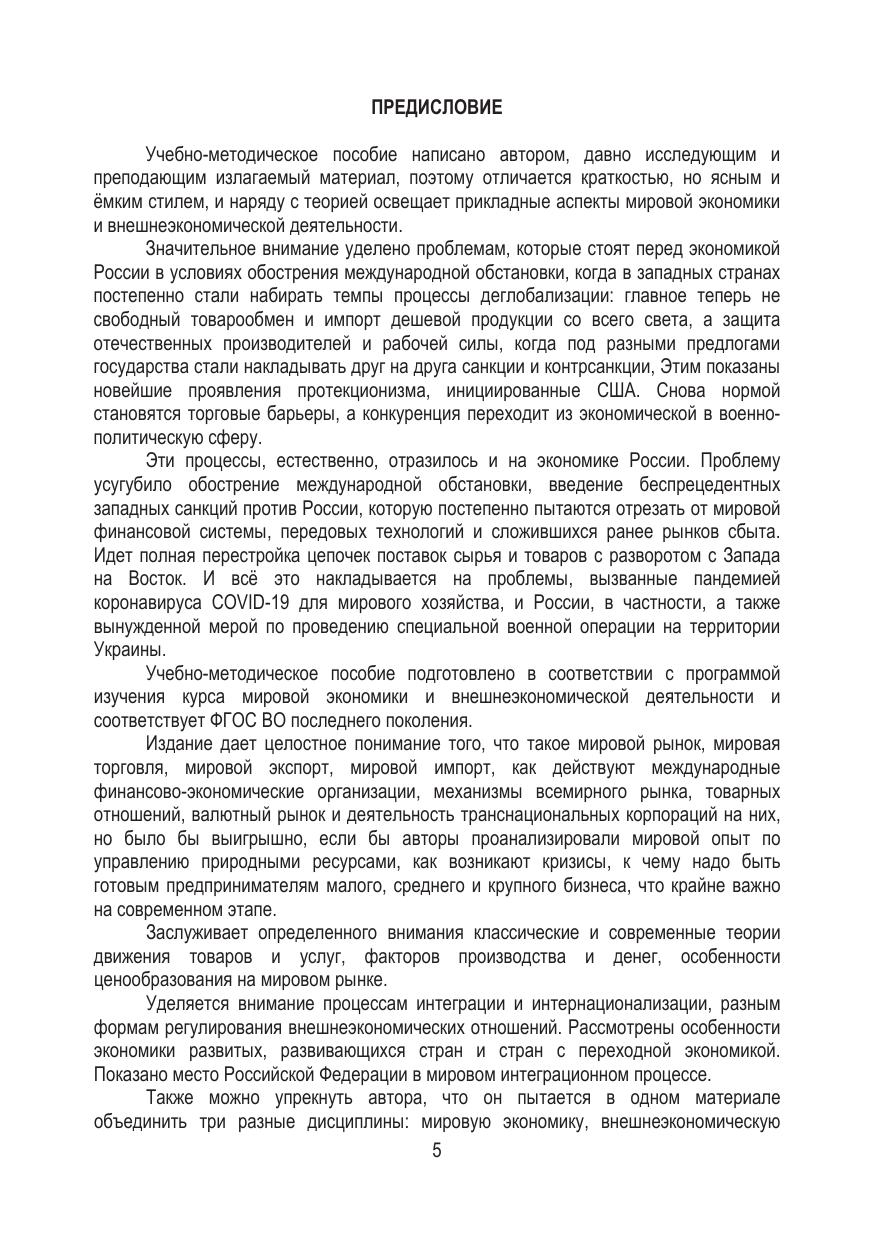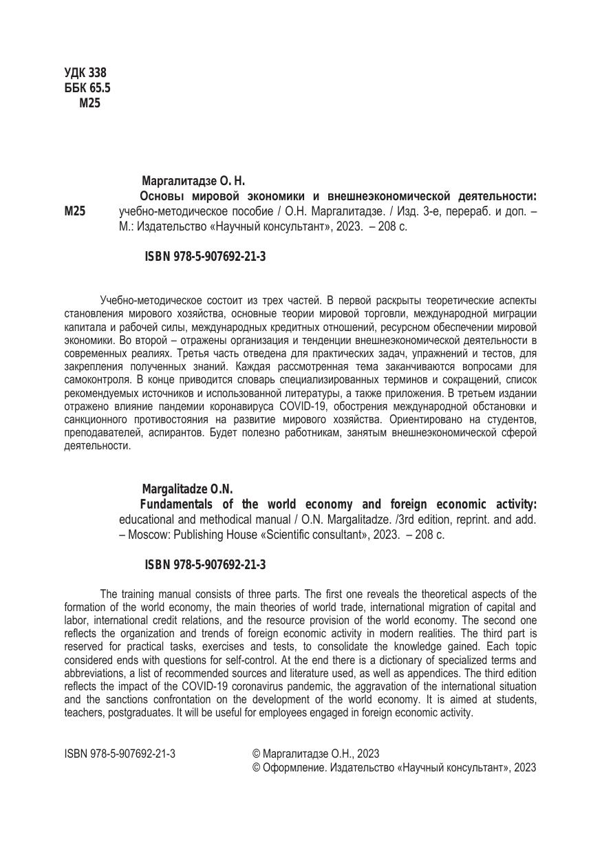 Учебно-методическое состоит из трех частей. В первой раскрыты теоретические аспекты становления мирового хозяйства, основные теории мировой торговли, международной миграции капитала и рабочей силы, международных кредитных отношений, ресурсном обеспечении мировой экономики. Во второй – отражены организация и тенденции внешнеэкономической деятельности в современных реалиях. Третья часть отведена для практических задач, упражнений и тестов, для закрепления полученных знаний. Каждая рассмотренная тема заканчиваются вопросами для самоконтроля. В конце приводится словарь специализированных терминов и сокращений, список рекомендуемых источников и использованной литературы, а также приложения. В третьем издании отражено влияние пандемии коронавируса COVID-19, обострения международной обстановки и санкционного противостояния на развитие мирового хозяйства. Ориентировано на студентов, преподавателей, аспирантов. Будет полезно работникам, занятым внешнеэкономической сферой деятельности.