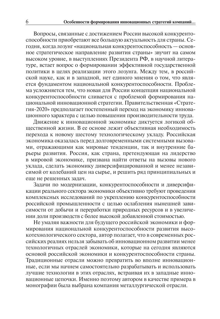 Предлагаемая монография посвящена весьма актуальной и острой для сегодняшней России проблемы формирования инновационных стратегий компаний. Новизна исследования состоит в рассмотрении взаимосвязи трех концепций (национальной конкурентоспособности, инновационного развития экономики и формирования стратегий компаний) применительно к микроэкономическому уровню экономики (компании), к отношениям, складывающимся между этим уровнем и остальными двумя уровнями экономики (отрасль-страна) и их роли в формировании национальной конкурентоспособности. Материалы и выводы, содержащиеся в данной монографии, могут быть использованы при разработке конкурентных инновационных стратегий, как в компаниях металлургической отрасли, так и в компаниях других отраслей. Содержащиеся в исследовании аналитические оценки и выводы могут быть использованы также и государственными органами РФ и организациями, занимающимися разработкой и реализацией российской инновационной политики и программ инновационного развития и повышения национальной конкурентоспособности. В целом проведенные в монографии материалы, их комплексный анализ могут представлять интерес для специалистов, преподавателей, студентов, изучающих проблемы формирования конкурентных инновационных стратегии компаний.