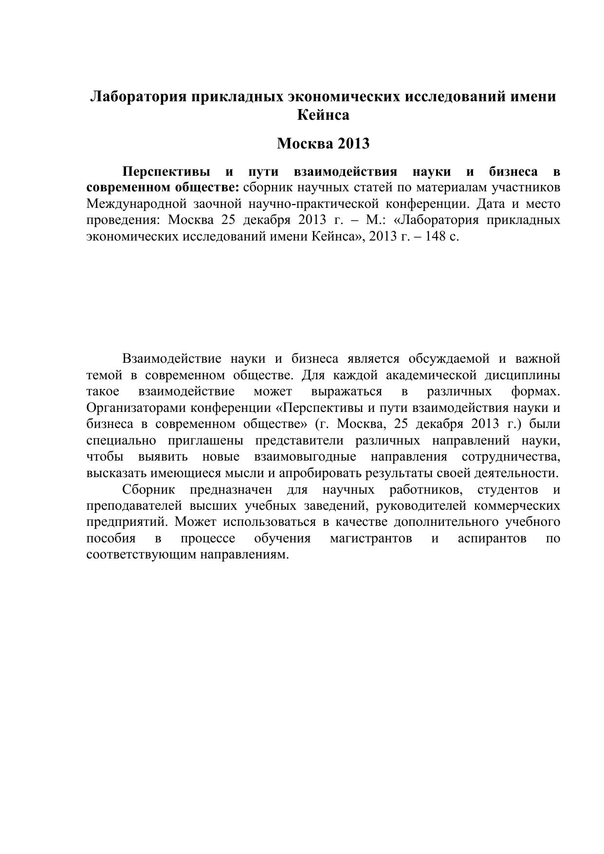 Взаимодействие науки и бизнеса является обсуждаемой и важной темой в современном обществе. Для каждой академической дисциплины такое взаимодействие может выражаться в различных формах. Организаторами конференции «Перспективы и пути взаимодействия науки и бизнеса в современном обществе» (г. Москва, 25 декабря 2013 г.) были специально приглашены представители различных направлений науки, чтобы выявить новые взаимовыгодные направления сотрудничества, высказать имеющиеся мысли и апробировать результаты своей деятельности. Сборник предназначен для научных работников, студентов и преподавателей высших учебных заведений, руководителей коммерческих предприятий. Может использоваться в качестве дополнительного учебного пособия в процессе обучения магистрантов и аспирантов по соответствующим направлениям.