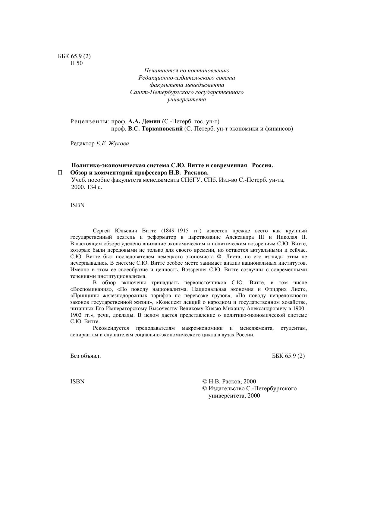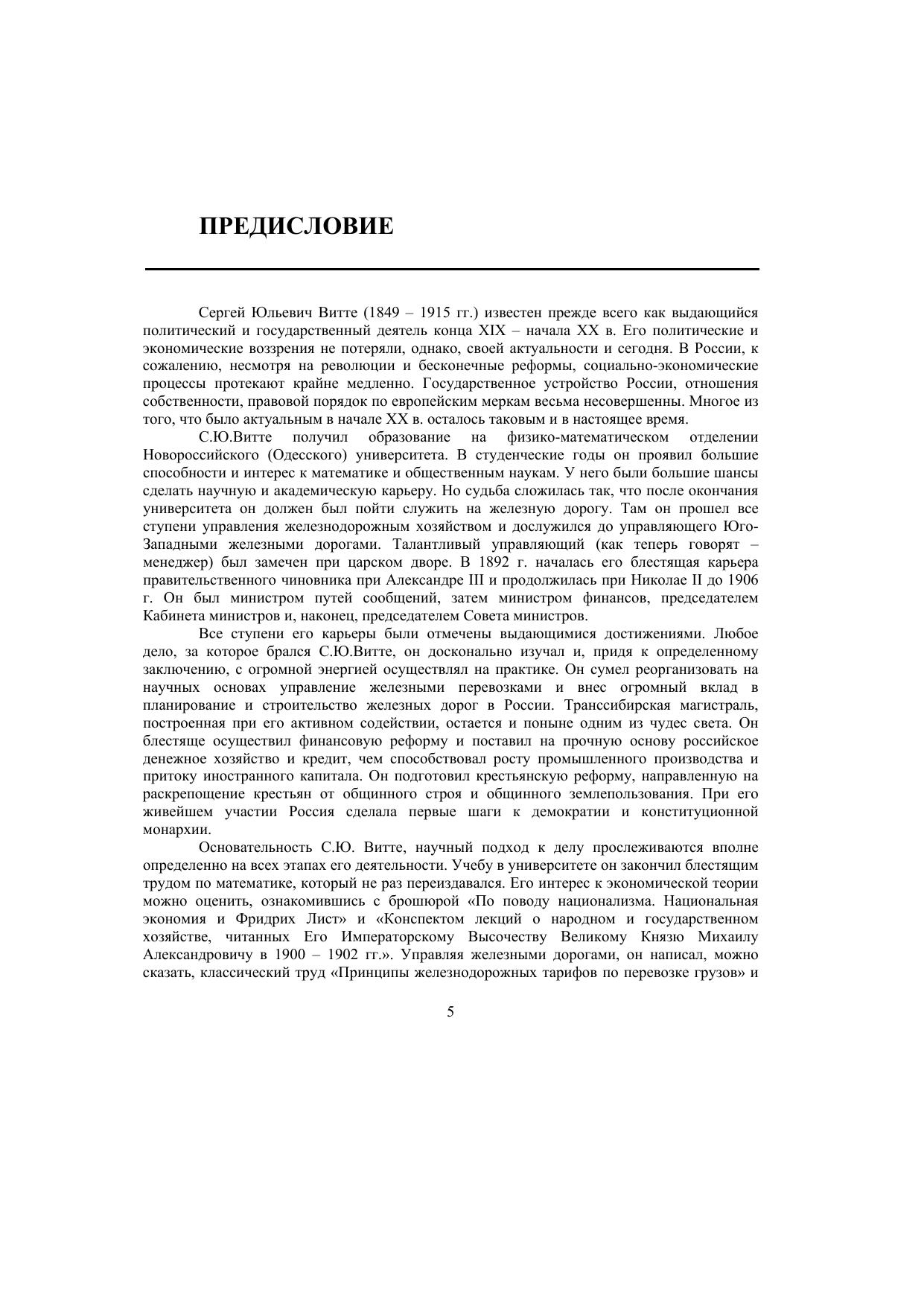 Сергей Юльевич Витте (1849-1915) известен прежде всего как крупный государственный деятель и реформатор в царствование Александра III и Николая II. В настоящей работе уделено внимание экономическим и политическим воззрениям С.Ю.Витте, которые были передовыми не только для своего времени, но остаются актуальными и сейчас. С.Ю.Витте был последователем немецкого экономиста Ф.Листа, но его взгляды этим не исчерпывались. В системе С.Ю.Витте особое место занимает анализ национальных институтов. В системе С.Ю.Витте особое место занимает анализ национальных институтов. Именно в этом ее своеобразие и ценность. Воззрения С.Ю.Витте созвучны современным течениям институционализма. В обзор включены тринадцать первоисточников С.Ю.Витте, в том числе "Воспоминания", "По поводу национализма. Национальная экономия и Фридрих Лист", "Принципы железнодорожных тарифов по перевозке грузов", "По поводу непреложности законов государственной жизни", "Конспект лекций о народном и государственном хозяйстве, читанных Его Императорскому Высочеству Великому князю Михаилу Александровичу в 1900-1902 гг.", речи, доклады. В целом дается представление о политико-экономической системе С.Ю.Витте. Рекомендуется преподавателям макроэкономики и менеджмента, студентам, аспирантам и слушателям социально-экономического цикла в вузах России.