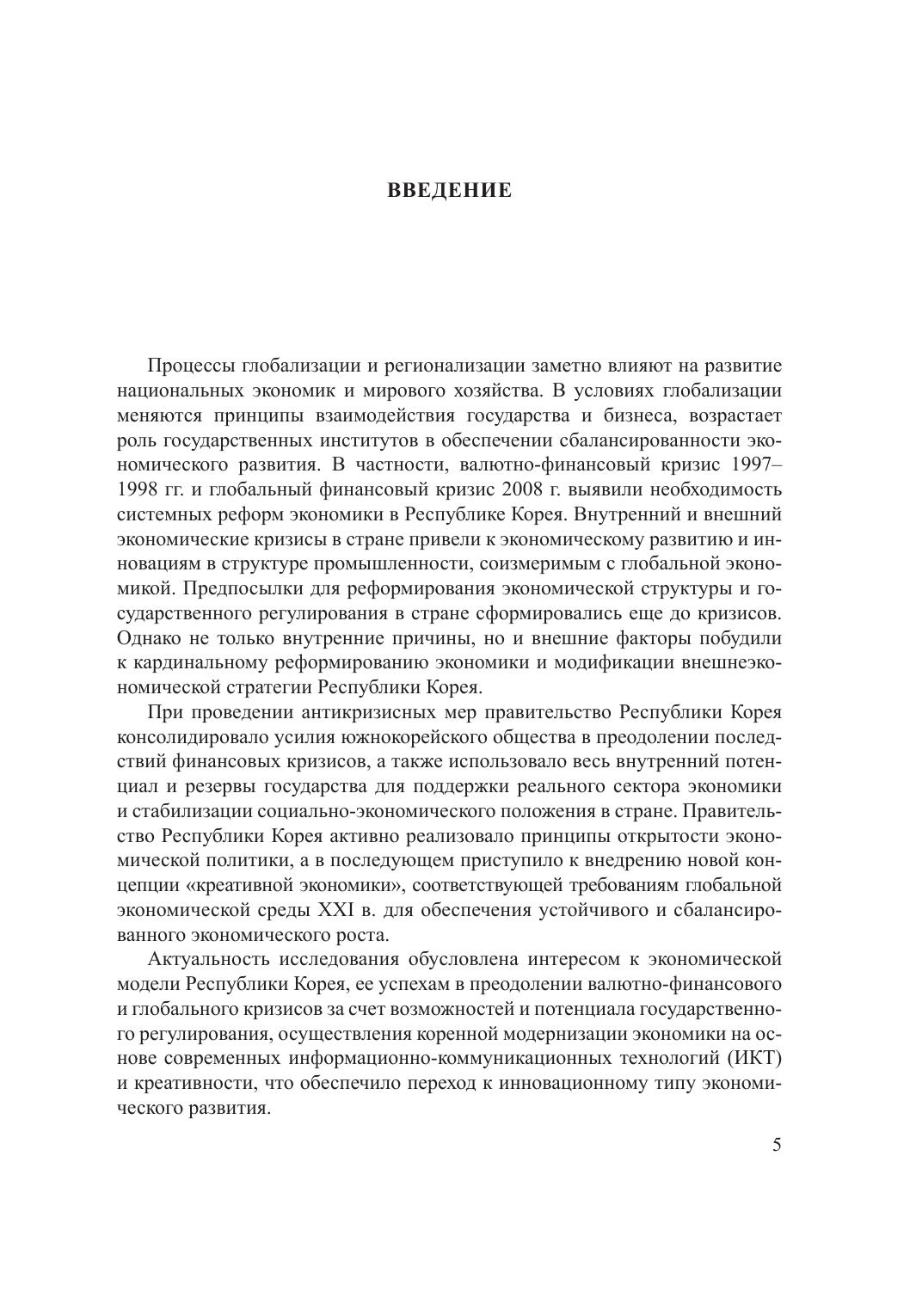 Монография посвящена исследованию особенностей развития экономики Республики Корея в современных условиях глобализации. В книге представлен процесс модели экономического развития Республики Корея, ее успехи в преодолении валютно-финансовых и глобальных кризисов за счет возможностей и потенциалов государственного регулирования, осуществления коренной модернизации экономики на основе современных информационно-коммуникационных технологий и креативности, что обеспечило переход к инновационному типу экономического развития.