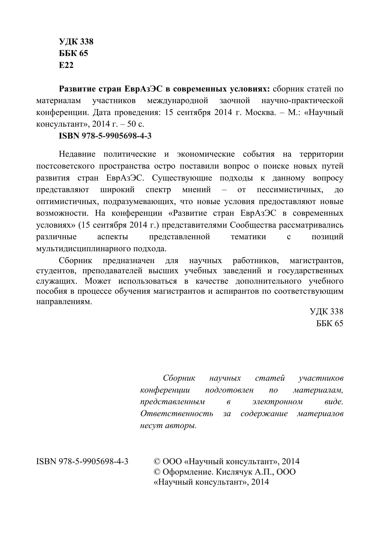 Недавние политические и экономические события на территории постсоветского пространства остро поставили вопрос о поиске новых путей развития стран ЕврАзЭС. Существующие подходы к данному вопросу представляют широкий спектр мнений – от пессимистичных, до оптимистичных, подразумевающих, что новые условия предоставляют новые возможности. На конференции «Развитие стран ЕврАзЭС в современных условиях» (15 сентября 2014 г.) представителями Сообщества рассматривались различные аспекты представленной тематики с позиций мультидисциплинарного подхода. Сборник предназначен для научных работников, магистрантов, студентов, преподавателей высших учебных заведений и государственных