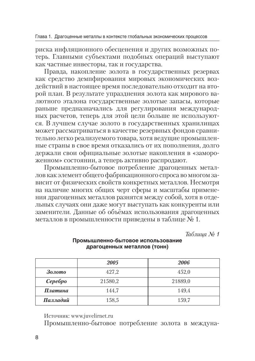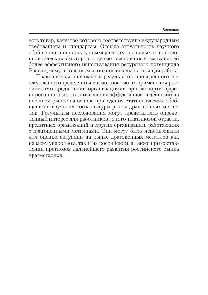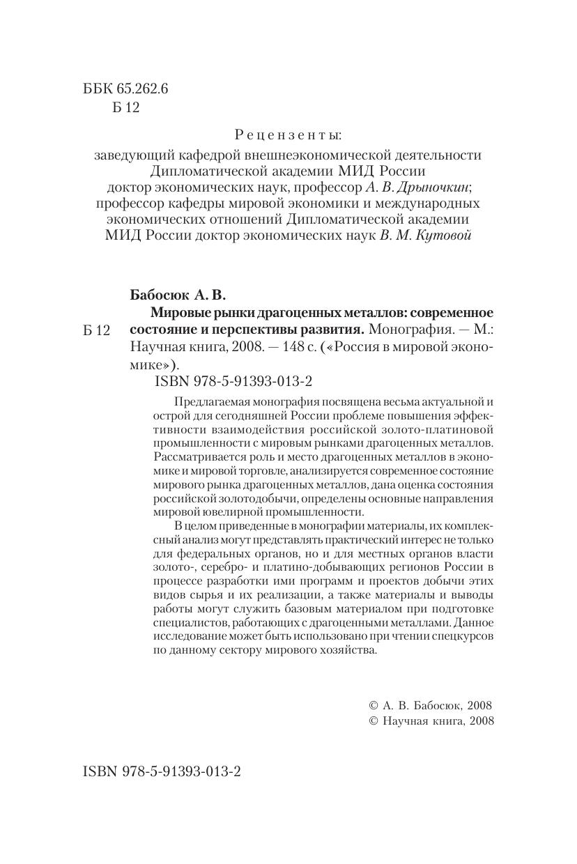 Предлагаемая монография посвящена весьма актуальной и острой для сегодняшней России проблеме повышения эффективности взаимодействия российской золото-платиновой промышленности с мировым рынками драгоценных металлов. Рассматривается роль и место драгоценных металлов в экономике и мировой торговле, анализируется современное состояние мирового рынка драгоценных металлов, дана оценка состояния российской золотодобычи, определены основные направления мировой ювелирной промышленности. В целом приведенные в монографии материалы, их комплексный анализ могут представлять практический интерес не только для федеральных органов, но и для местных органов власти золото-, серебро- и платино-добывающих регионов России в процессе разработки ими программ и проектов добычи этих видов сырья и их реализации, а также материалы и выводы работы могут служить базовым материалом при подготовке специалистов, работающих с драгоценными металлами. Данное исследование может быть использовано при чтении спецкурсов по данному сектору мирового хозяйства.