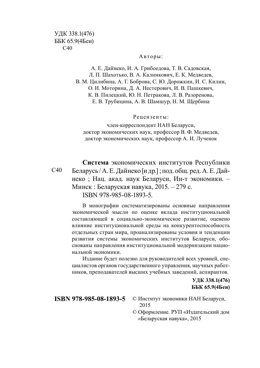 В монографии систематизированы основные направления экономической мысли по оценке вклада институциональной составляющей в социально-экономическое развитие, оценено влияние институциональной среды на конкурентоспособность отдельных стран мира, проанализированы условия и тенденции развития системы экономических институтов Беларуси, обоснованы направления институциональной модернизации национальной экономики. Издание будет полезно для руководителей всех уровней, специалистов органов государственного управления, научных работников, преподавателей высших учебных заведений, аспирантов.