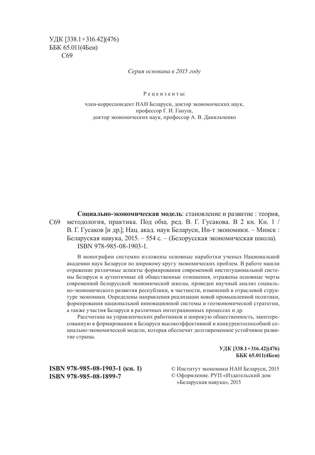 В монографии системно изложены основные наработки ученых Национальной академии наук Беларуси по широкому кругу экономических проблем. В работе нашли отражение различные аспекты формирования современной институциональной системы Беларуси и аутентич ные ей общественные отношения, отражены основные черты современной белорусской экономической школы, проведен научный анализ социально-экономического развития республики, в частности, изменений в отраслевой структуре экономики. Определены направления реализации новой промышленной политики, формирования национальной инновационной системы и геоэкономической стратегии, а также участия Беларуси в различных интеграционных процессах и др. Рассчитана на управленческих работников и широкую общественность, заинтересованную в формировании в Беларуси высокоэффективной и конкурентоспособной социально-экономической модели, которая обеспечит долговременное устойчивое развитие страны.