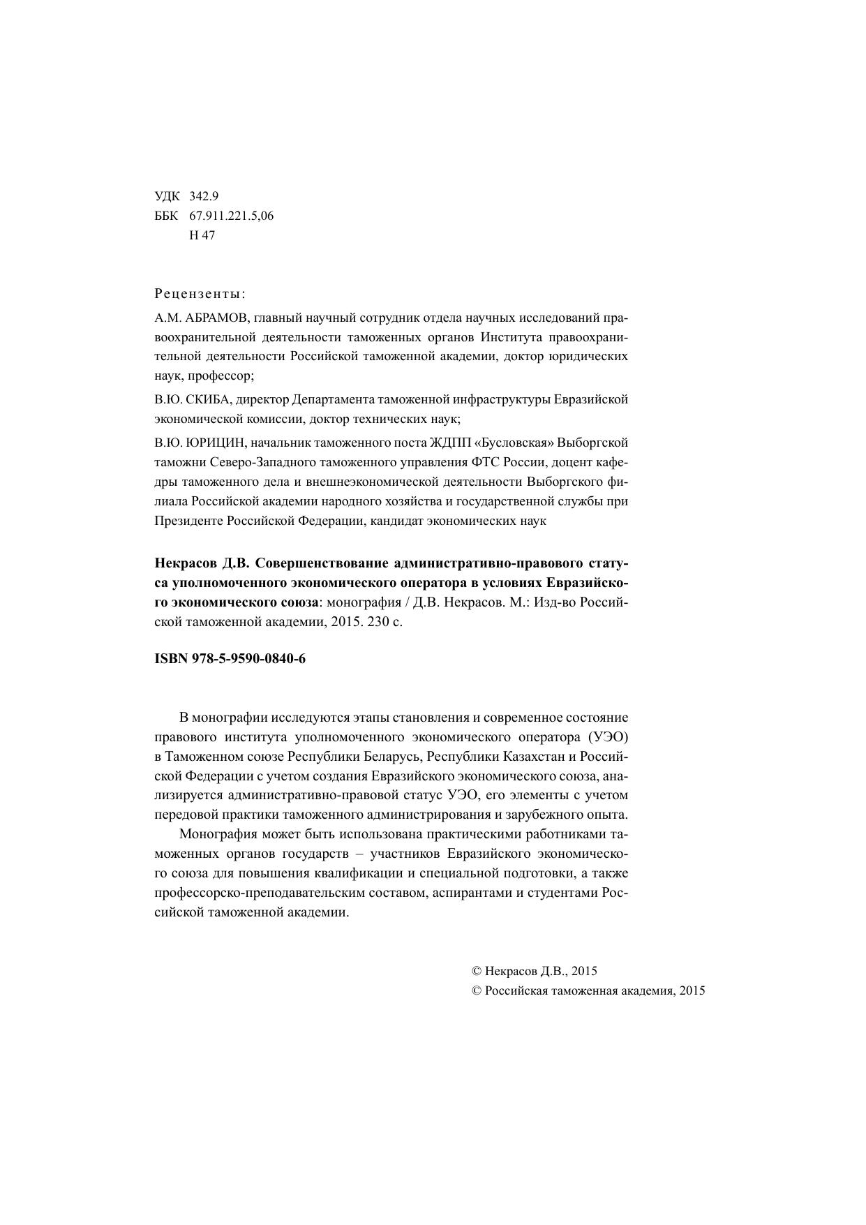 В монографии исследуются этапы становления и современное состояние правового института уполномоченного экономического оператора (УЭО) в Таможенном союзе Республики Беларусь, Республики Казахстан и Российской Федерации с учетом создания Евразийского экономического союза, анализируется административно-правовой статус УЭО, его элементы с учетом передовой практики таможенного администрирования и зарубежного опыта. Монография может быть использована практическими работниками таможенных органов государств – участников Евразийского экономического союза для повышения квалификации и специальной подготовки, а также профессорско-преподавательским составом, аспирантами и студентами Российской таможенной академии.
