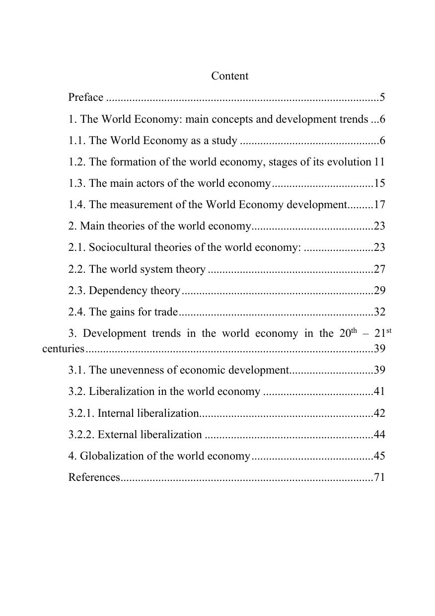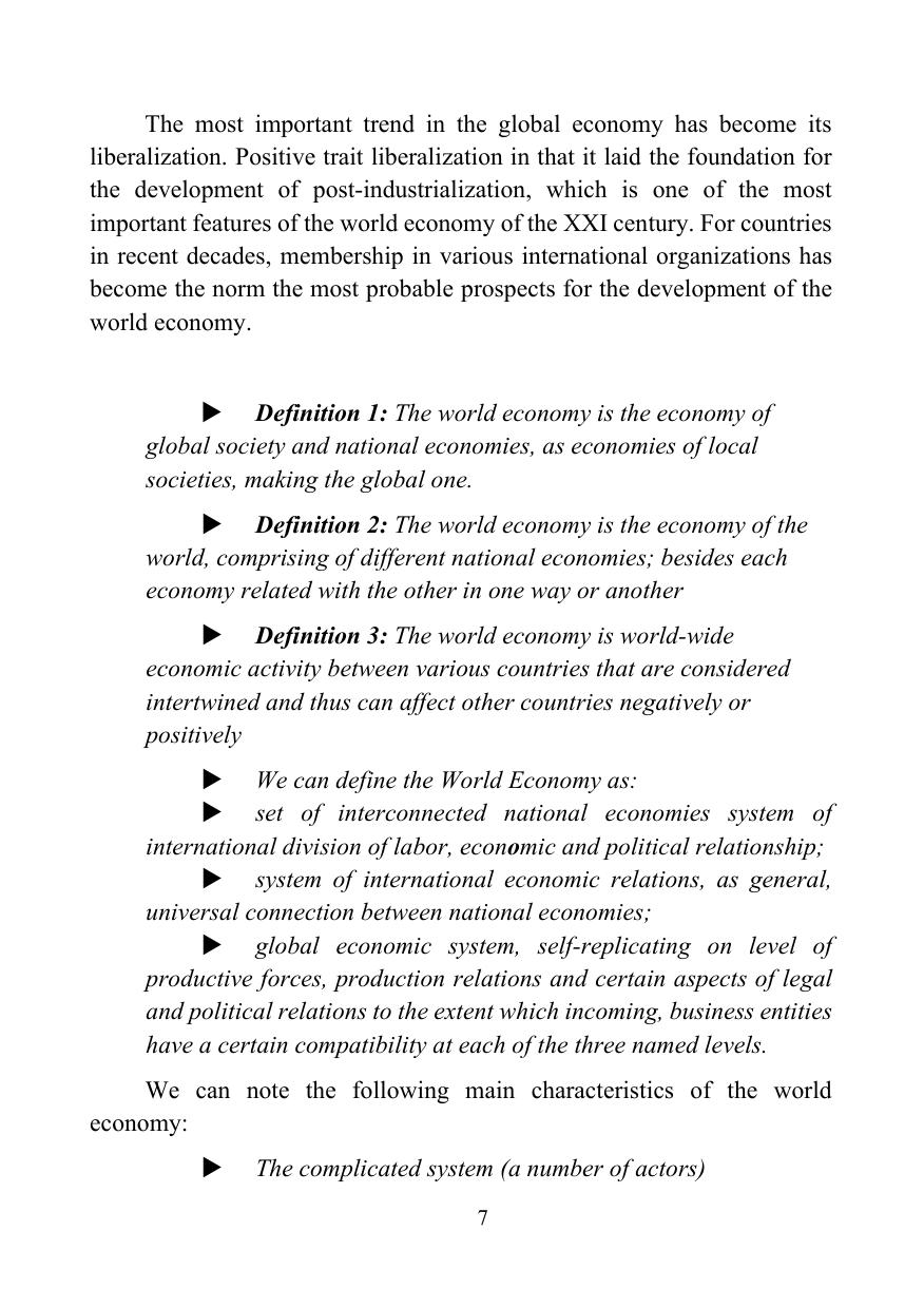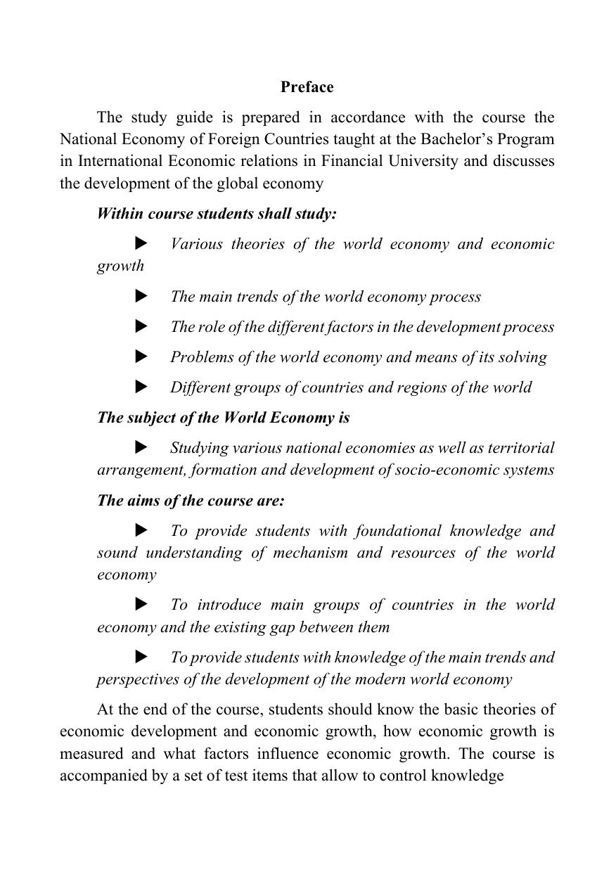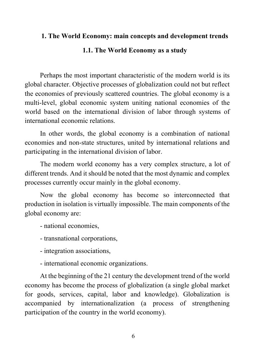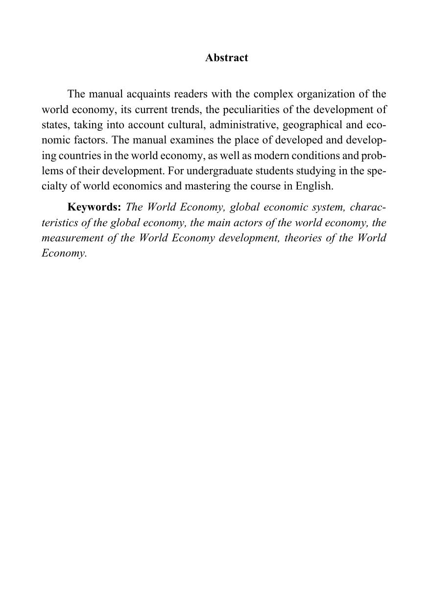 The manual acquaints readers with the complex organization of the world economy, its current trends, the peculiarities of the development of states, taking into account cultural, administrative, geographical and economic factors. The manual examines the place of developed and developing countries in the world economy, as well as modern conditions and problems of their development. For undergraduate students studying in the specialty of world economics and mastering the course in English.