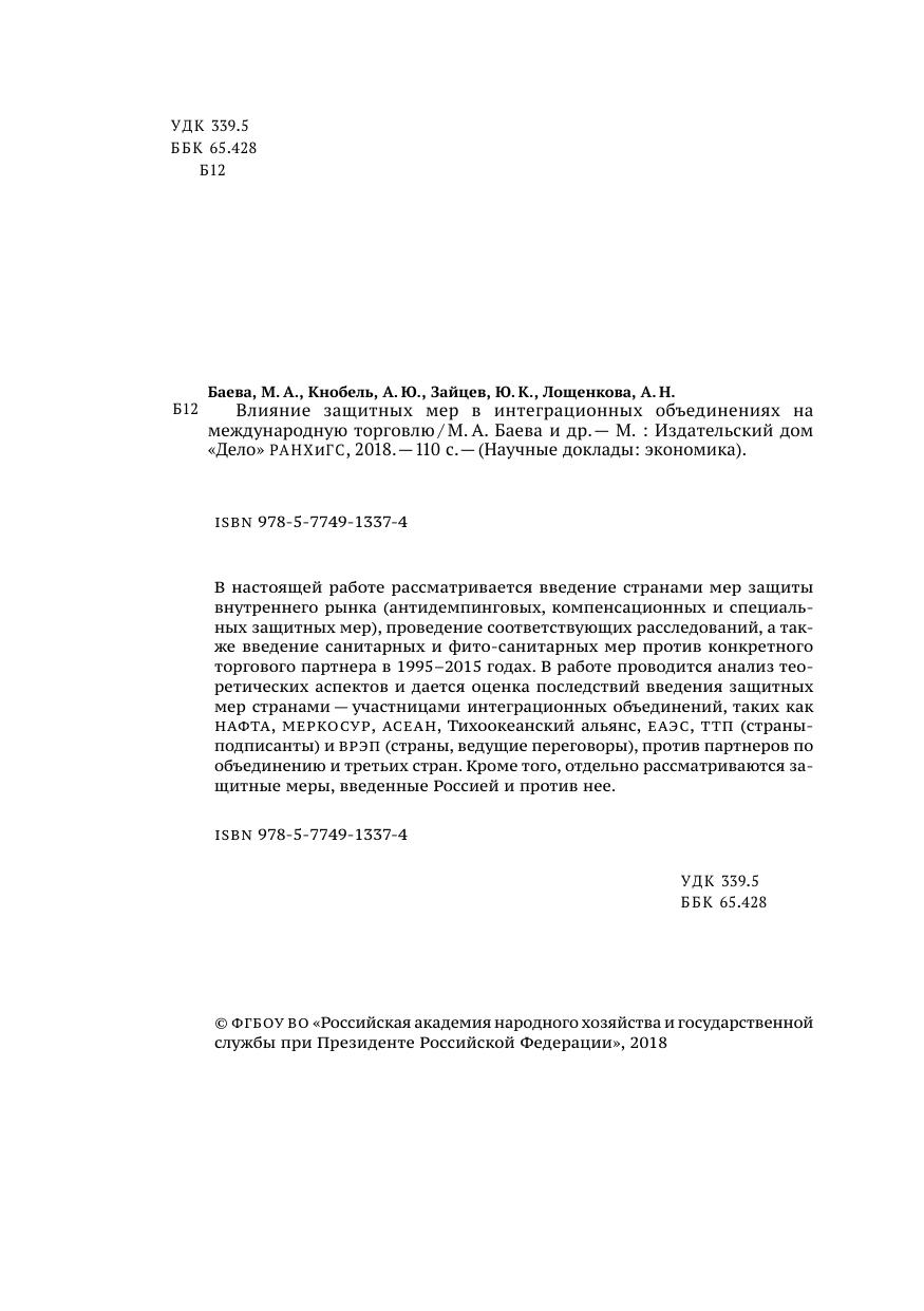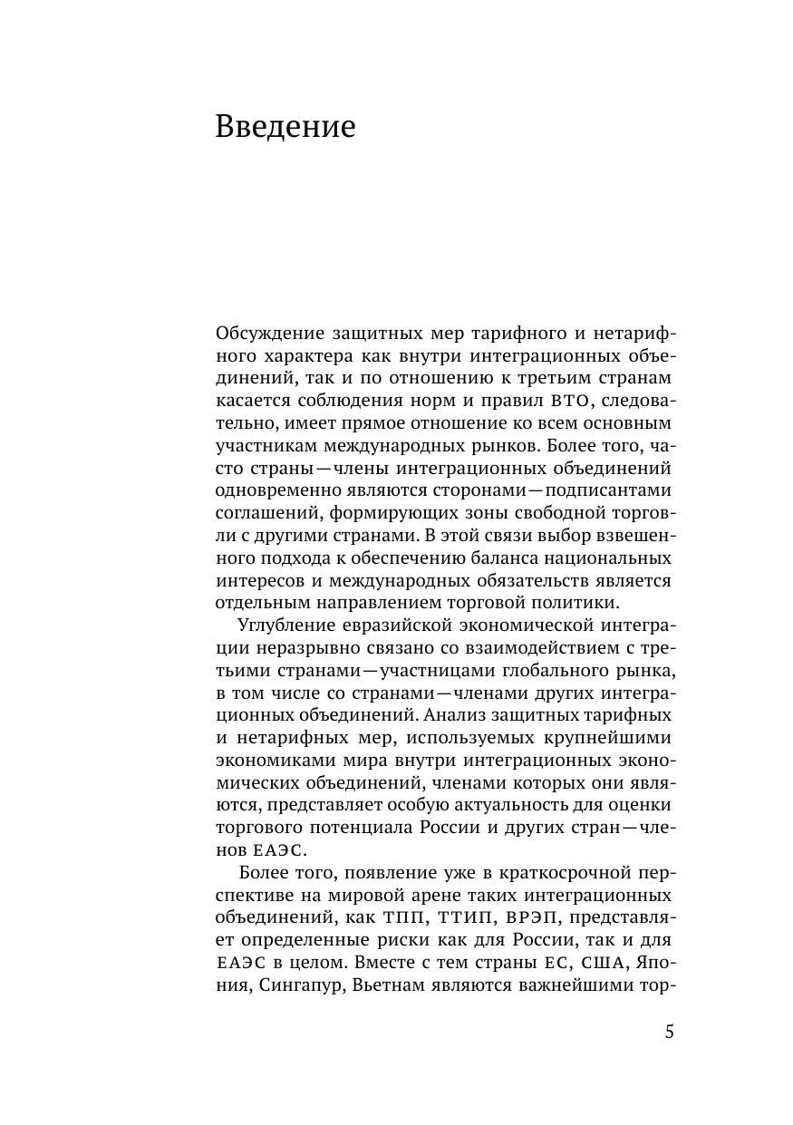 В настоящей работе рассматривается введение странами мер защиты внутреннего рынка (антидемпинговых, компенсационных и специальных защитных мер), проведение соответствующих расследований, а также введение санитарных и фитосанитарных мер против конкретного торгового партнера в 1995–2015 годах. В работе проводится анализ теоретических аспектов и дается оценка последствий введения защитных мер странами — участницами интеграционных объединений, таких как НАФТА, МЕРКОСУР, АСЕАН, Тихоокеанский альянс, ЕАЭС, ТТП (страны-подписанты) и ВРЭП (страны, ведущие переговоры), против партнеров по объединению и третьих стран. Кроме того, отдельно рассматриваются защитные меры, введенные Россией и против нее.