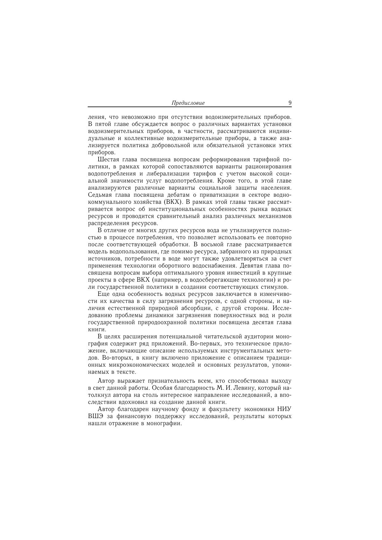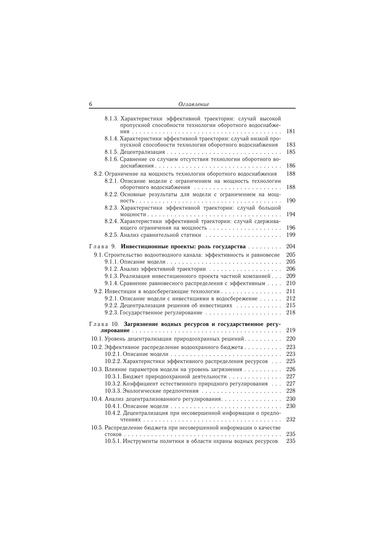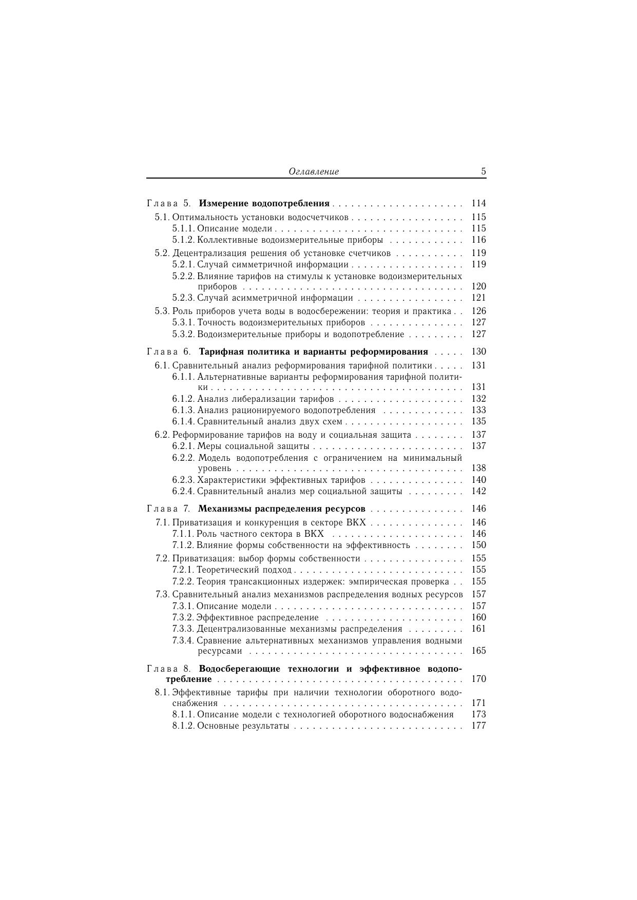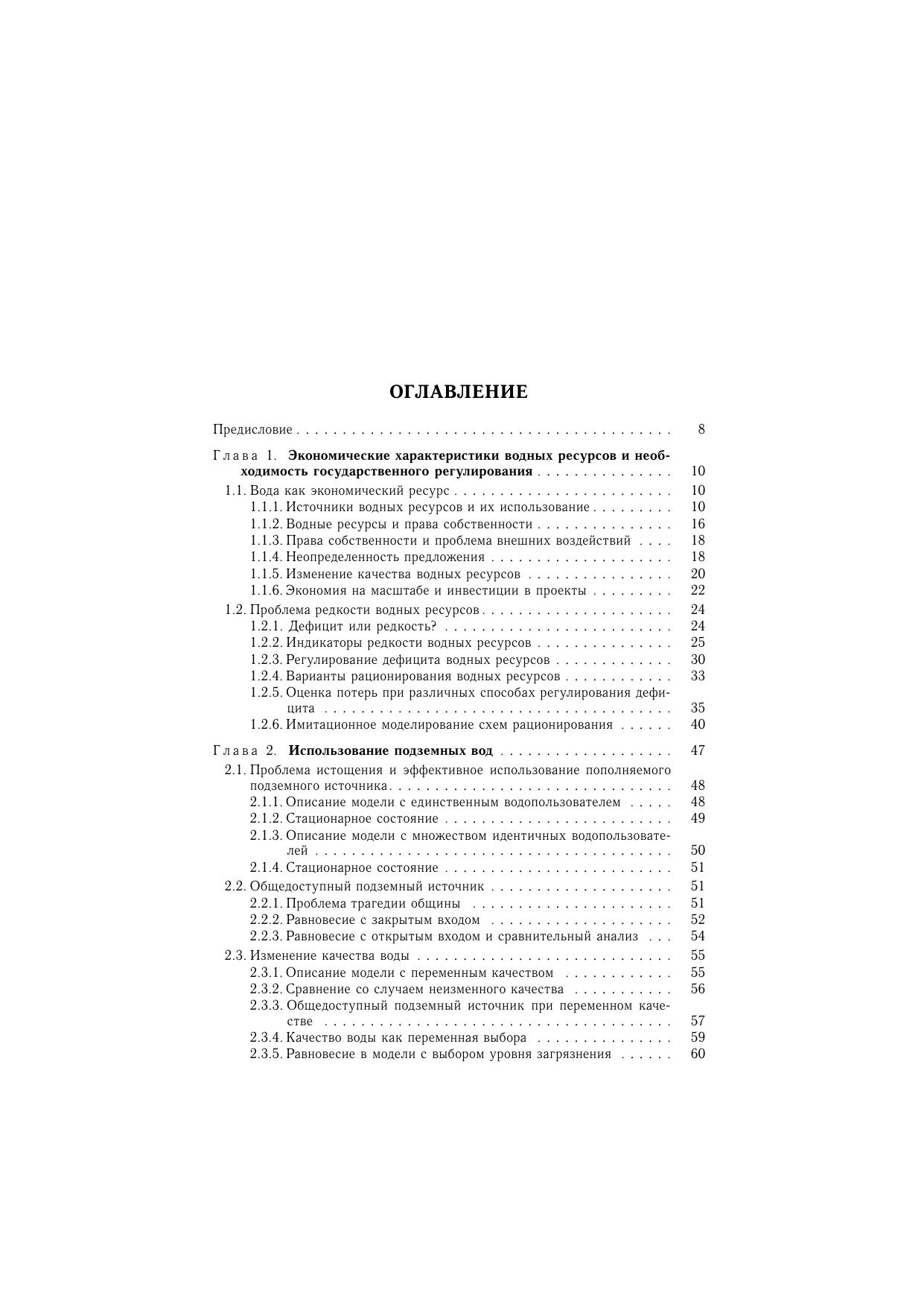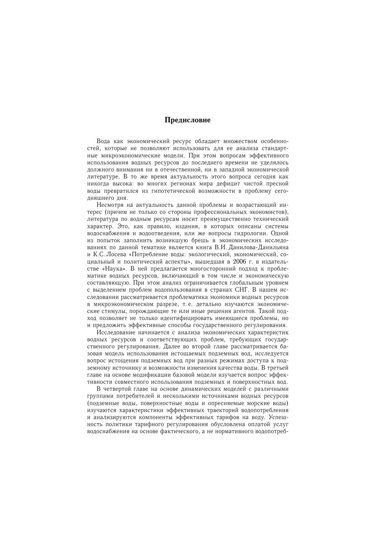 В монографии представлено теоретическое исследование проблемы дефицита чистой воды и роли государственной политики в решении этой проблемы. Рассматриваются особенности воды как экономического ресурса, эффективность водопользования при наличии различных источников водных ресурсов, вопрос формирования эффективных тарифов на воду, подходы к реформированию сложившейся неэффективной системы тарифов. Кроме того, обсуждаются проблемы измерения водопотребления, использование водосберегающих технологий и эффективность инвестиций в водосбережение, а также вопросы загрязнения водных ресурсов и государственного регулирования. Книга содержит приложения с описанием используемого математического и экономического инструментария, что позволяет расширить читательскую аудиторию. Для научных сотрудников, преподавателей, студентов магистратуры и аспирантов, интересующихся экономикой природопользования. Книга может также быть полезна студентам, аспирантам и преподавателям, специализирующимся в области прикладной математики.
