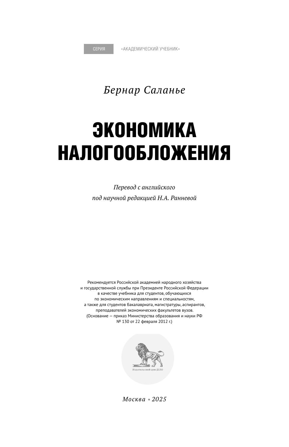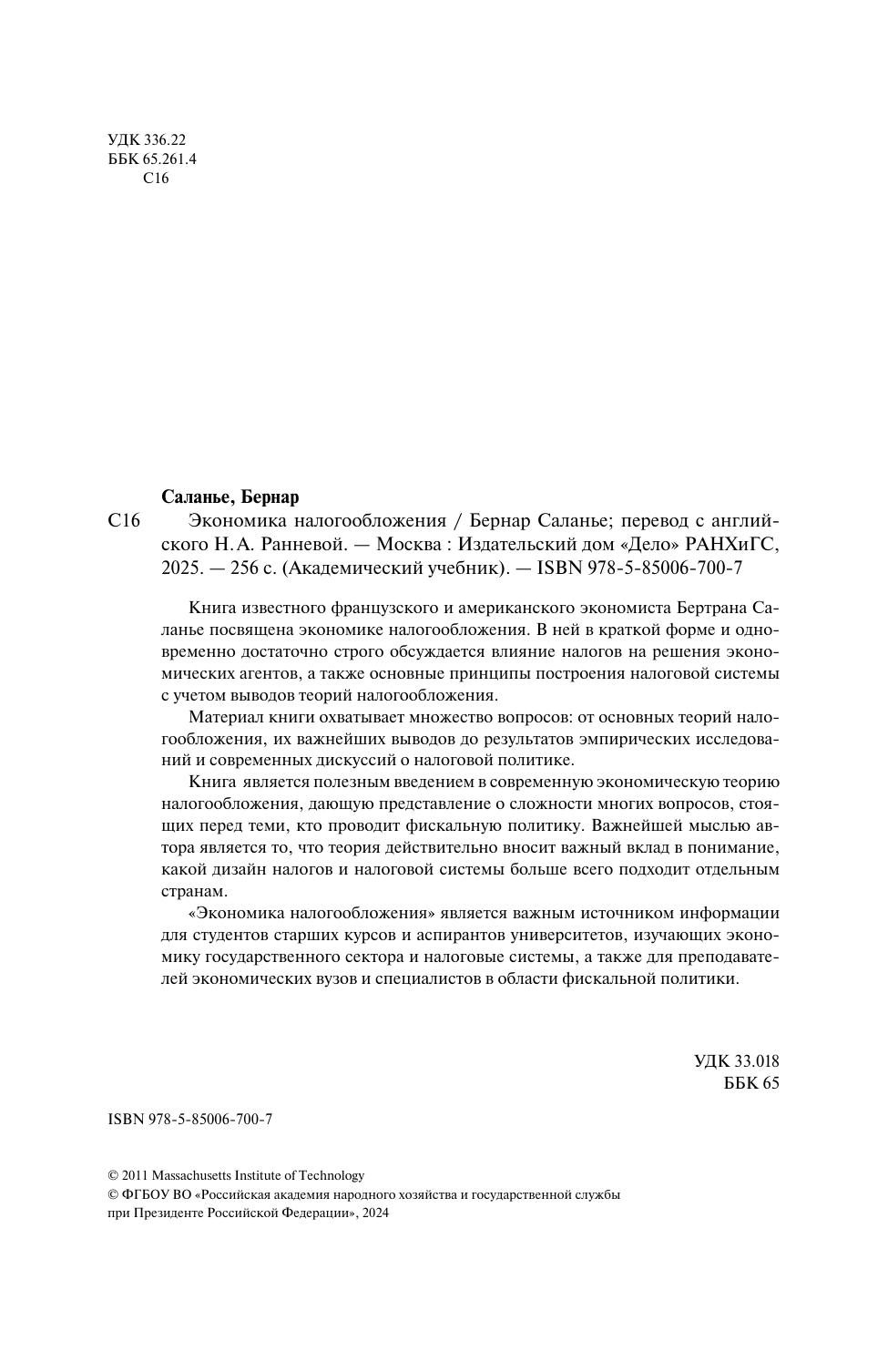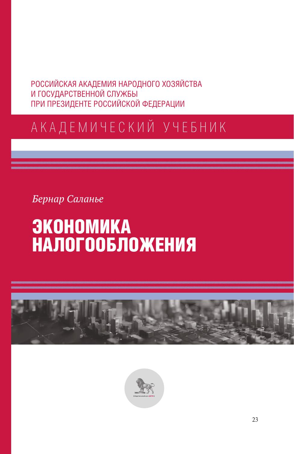 Книга известного французского и американского экономиста Бертрана Саланье посвящена экономике налогообложения. В ней в краткой форме и одновременно достаточно строго обсуждается влияние налогов на решения экономических агентов, а также основные принципы построения налоговой системы с учетом выводов теорий налогообложения. Материал книги охватывает множество вопросов: от основных теорий налогообложения, их важнейших выводов до результатов эмпирических исследований и современных дискуссий о налоговой политике. Книга является полезным введением в современную экономическую теорию налогообложения, дающую представление о сложности многих вопросов, стоящих перед теми, кто проводит фискальную политику. Важнейшей мыслью автора является то, что теория действительно вносит важный вклад в понимание, какой дизайн налогов и налоговой системы больше всего подходит отдельным странам. «Экономика налогообложения» является важным источником информации для студентов старших курсов и аспирантов университетов, изучающих экономику государственного сектора и налоговые системы, а также для преподавателей экономических вузов и специалистов в области фискальной политики.
