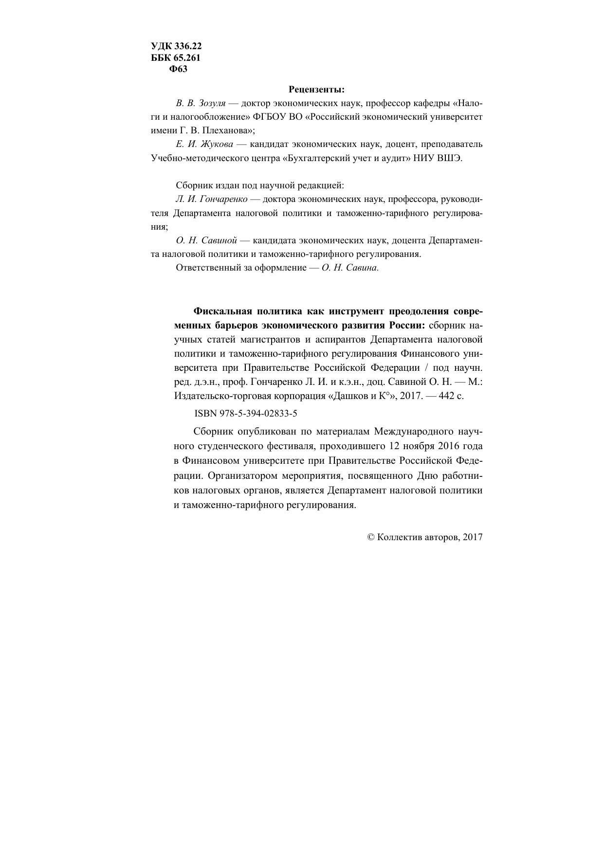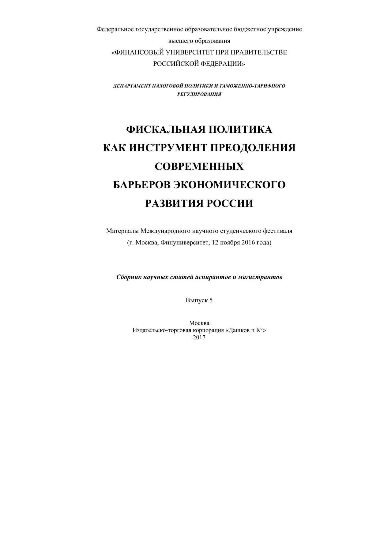 Фискальная политика как инструмент преодоления современных барьеров экономического развития России: сборник научных статей
