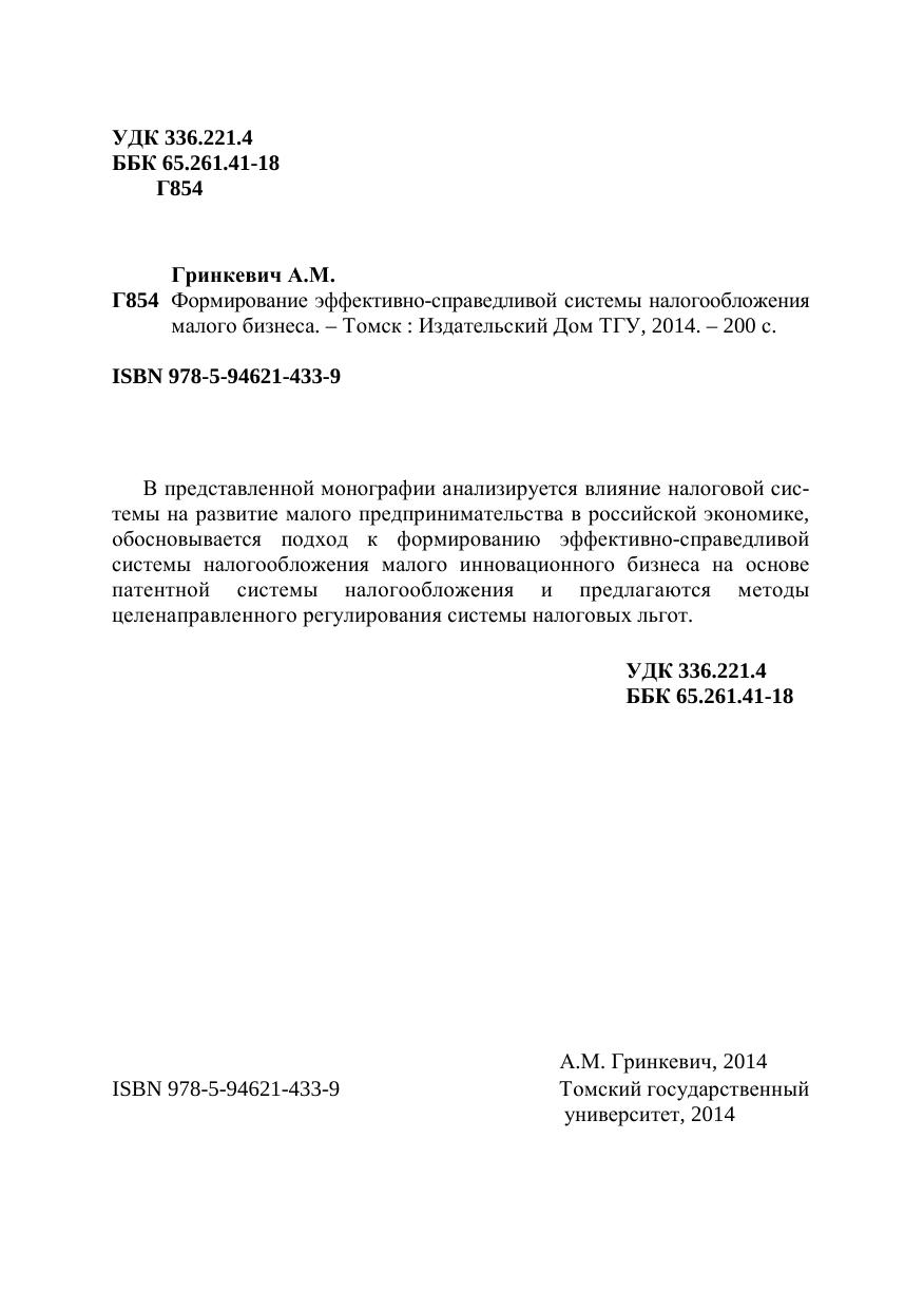 В представленной монографии анализируется влияние налоговой системы на развитие малого предпринимательства в российской экономике, обосновывается подход к формированию эффективно-справедливой системы налогообложения малого инновационного бизнеса на основе патентной системы налогообложения и предлагаются методы целенаправленного регулирования системы налоговых льгот