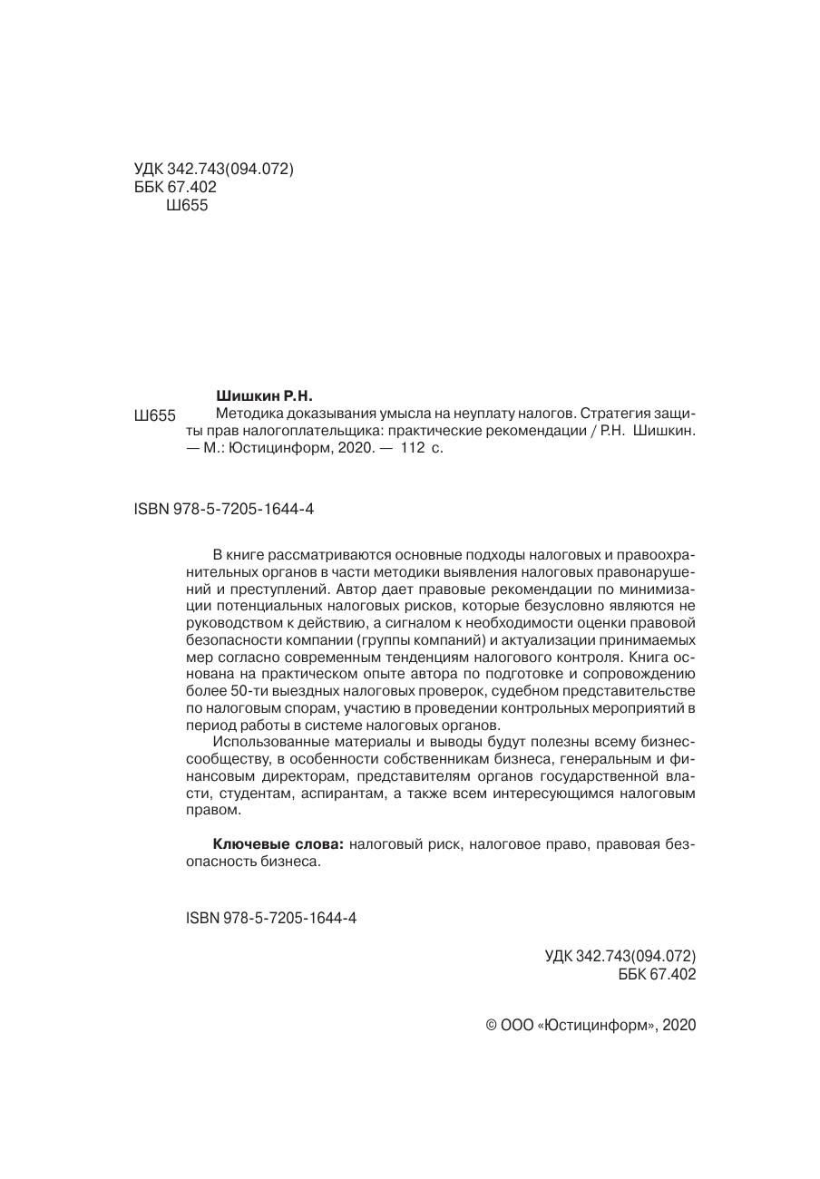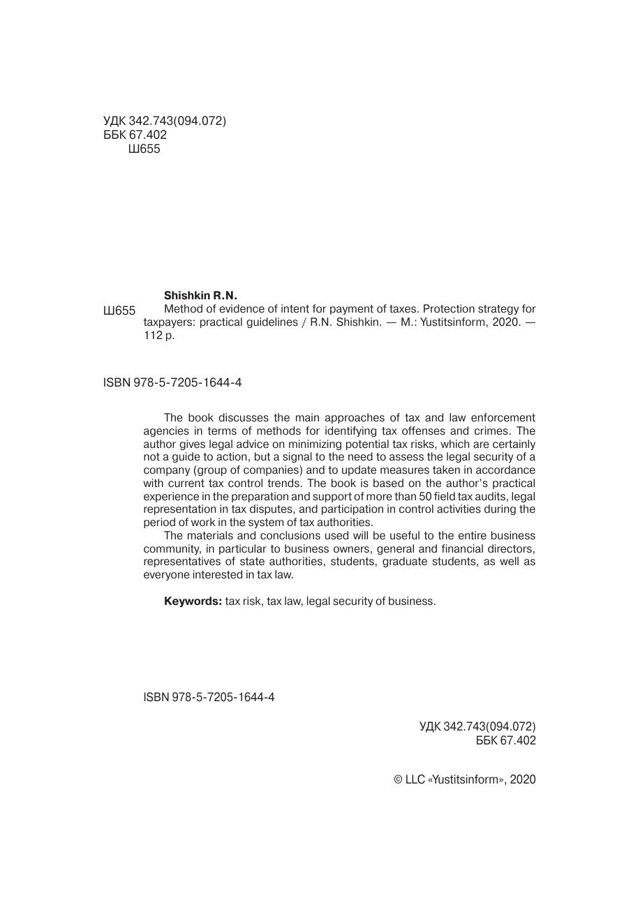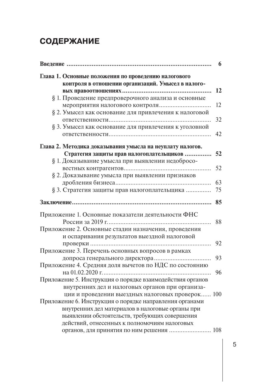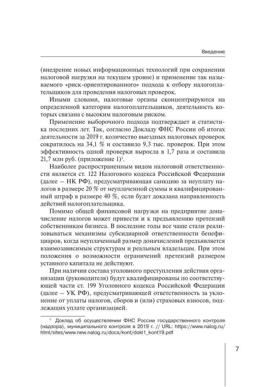 В книге рассматриваются основные подходы налоговых и правоохранительных органов в части методики выявления налоговых правонарушений и преступлений. Автор дает правовые рекомендации по минимизации потенциальных налоговых рисков, которые безусловно являются не руководством к действию, а сигналом к необходимости оценки правовой безопасности компании (группы компаний) и актуализации принимаемых мер согласно современным тенденциям налогового контроля. Книга основана на практическом опыте автора по подготовке и сопровождению более 50-ти выездных налоговых проверок, судебном представительстве по налоговым спорам, участию в проведении контрольных мероприятий в период работы в системе налоговых органов. Использованные материалы и выводы будут полезны всему бизнес-сообществу, в особенности собственникам бизнеса, генеральным и финансовым директорам, представителям органов государственной власти, студентам, аспирантам, а также всем интересующимся налоговым правом.