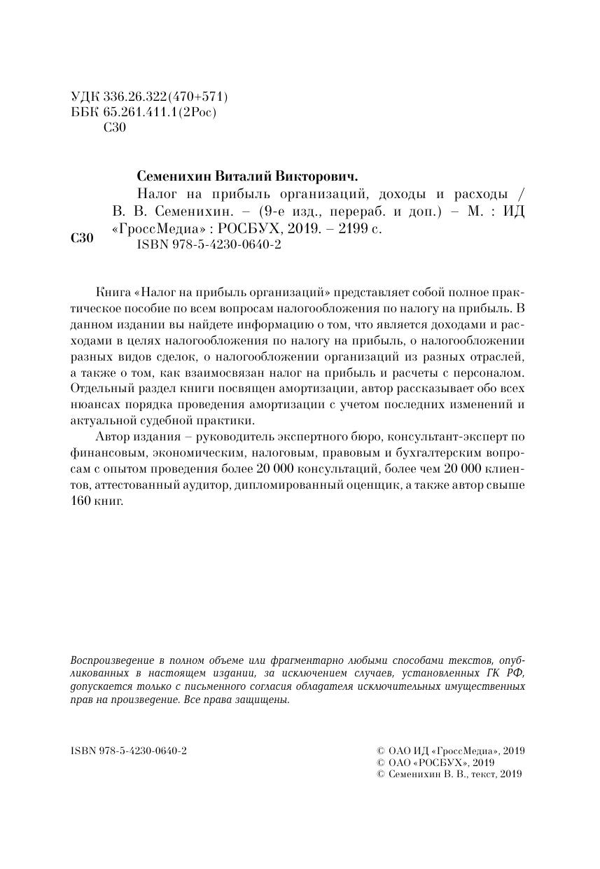 Книга «Налог на прибыль организаций» представляет собой полное практическое пособие по всем вопросам налогообложения по налогу на прибыль. В данном издании вы найдете информацию о том, что является доходами и расходами в целях налогообложения по налогу на прибыль, о налогообложении разных видов сделок, о налогообложении организаций из разных отраслей, а также о том, как взаимосвязан налог на прибыль и расчеты с персоналом. Отдельный раздел книги посвящен амортизации, автор рассказывает обо всех нюансах порядка проведения амортизации с учетом последних изменений и актуальной судебной практики. Автор издания – руководитель экспертного бюро, консультант-эксперт по финансовым, экономическим, налоговым, правовым и бухгалтерским вопросам с опытом проведения более 20 000 консультаций, более чем 20 000 клиентов, аттестованный аудитор, дипломированный оценщик, а также автор свыше 160 книг.