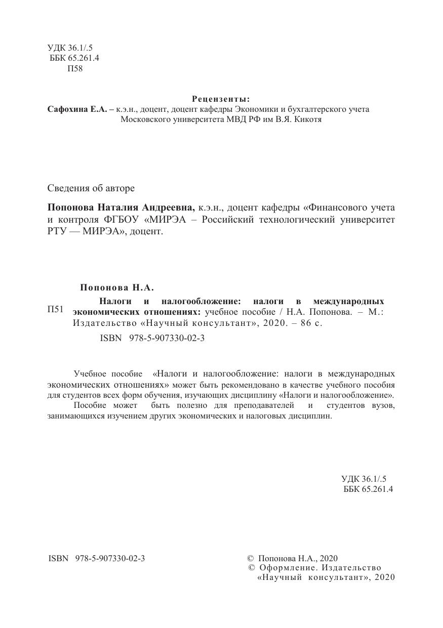 Учебное пособие. «Налоги и налогообложение: налоги в международных экономических отношениях» может быть рекомендовано в качестве учебного пособия для студентов всех форм обучения, изучающих дисциплину «Налоги и налогообложение».