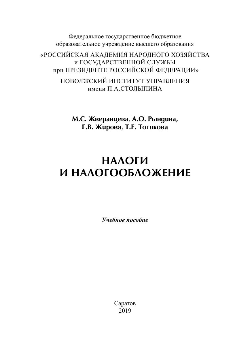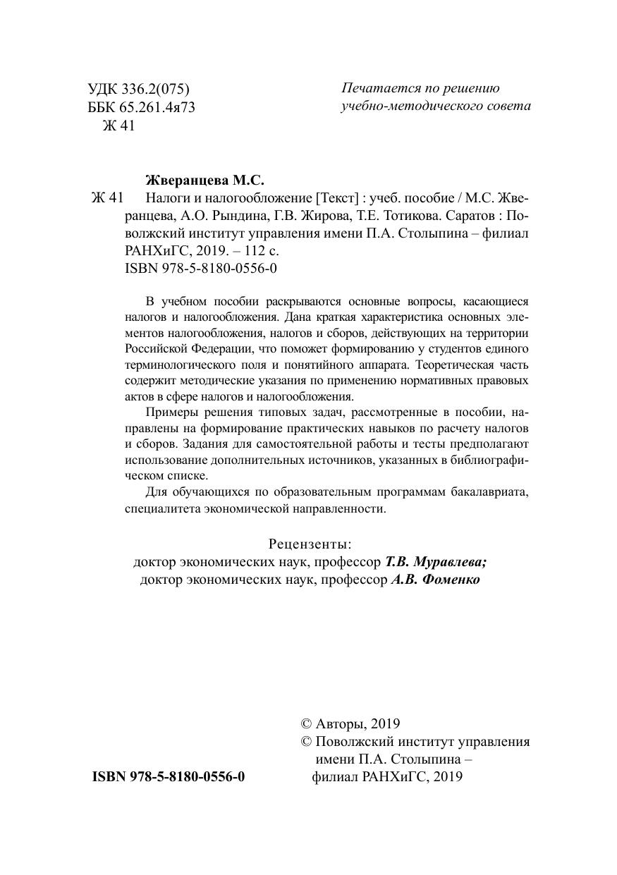В учебном пособии раскрываются основные вопросы, касающиеся налогов и налогообложения. Дана краткая характеристика основных элементов налогообложения, налогов и сборов, действующих на территории Российской Федерации, что поможет формированию у студентов единого терминологического поля и понятийного аппарата. Теоретическая часть содержит методические указания по применению нормативных правовых актов в сфере налогов и налогообложения. Примеры решения типовых задач, рассмотренные в пособии, направлены на формирование практических навыков по расчету налогов и сборов. Задания для самостоятельной работы и тесты предполагают использование дополнительных источников, указанных в библиографическом списке. Для обучающихся по образовательным программам бакалавриата, специалитета экономической направленности.