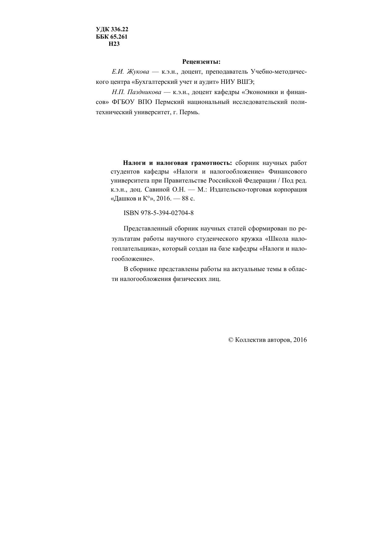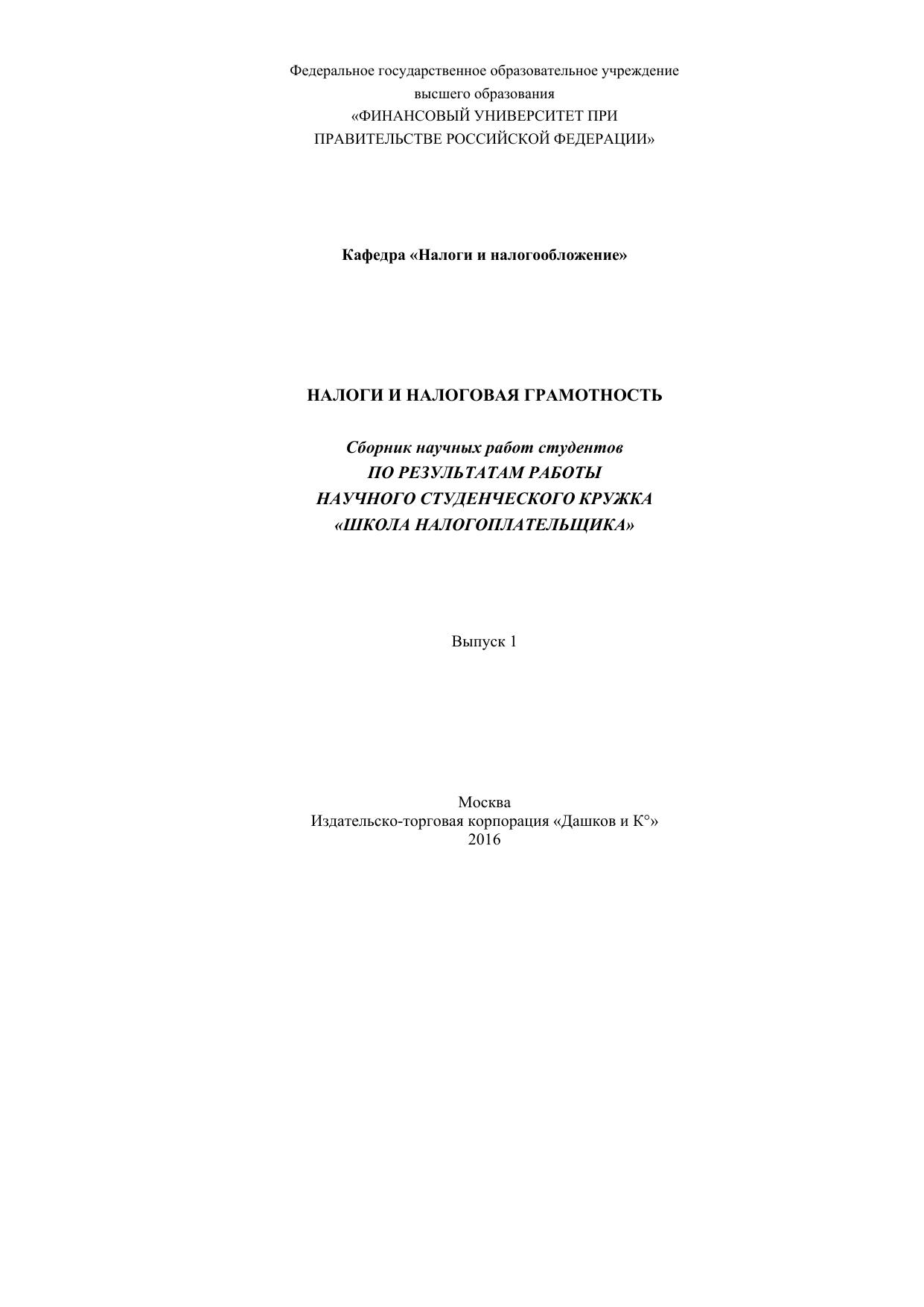 Представленный сборник научных статей сформирован по результатам работы научного студенческого кружка «Школа налогоплательщика», который создан на базе кафедры «Налоги и налогообложение». В сборнике представлены работы на актуальные темы в области налогообложения физических лиц.