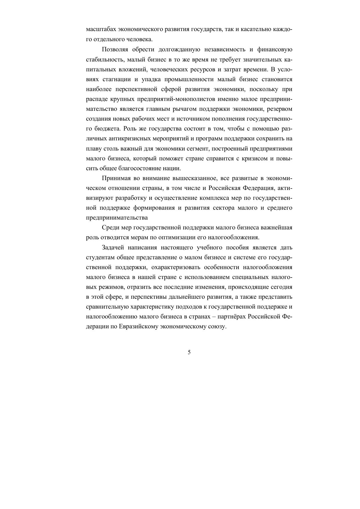 В учебном пособии охарактеризовано место малого и среднего бизнеса в экономической системе общества, отражены меры по его государственной поддержке, подходы к налогообложению. Дана подробная характеристика специальных налоговых режимов, возможных для использования субъектами малого предпринимательства – упрощённой системы налогообложения, системы налогообложения в виде единого налога на вменённый доход для отдельных видов деятельности, патентной системы налогообложения. Рассмотрены перспективы дальнейшего развития налогообложения и государственной поддержки малого бизнеса в России, а также опыт налогообложения и государственной поддержки малого бизнеса в государствах, входящих наряду с Российской Федерацией в Евразийский экономический союз. Для студентов бакалавриата, обучающихся по направлению подготовки «Экономика» преподавателей и научных работников.