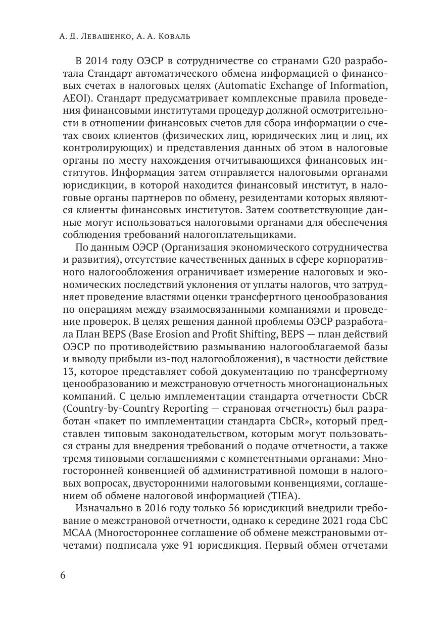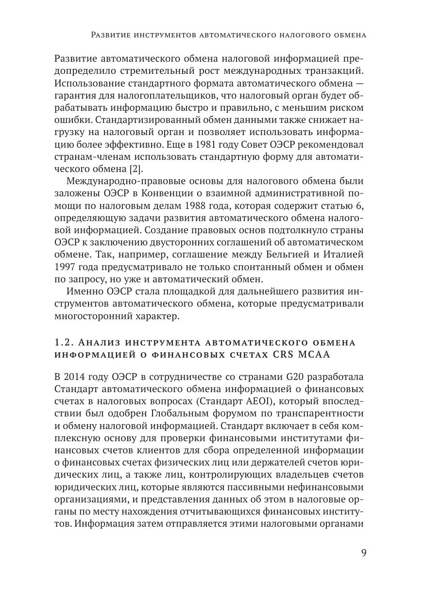 Предметом настоящего исследования являются вопросы правового оформления и правоприменительной практики современных международных инструментов автоматического обмена налоговой информацией. Актуальность настоящего исследования определяется интенсивной повесткой международного сотрудничества стран по повышению транспарентности национальных экономик и борьбе с финансовыми преступлениями, включая уклонение от уплаты налогов. Цель исследования — оценить уровень развития инструментов автоматического налогового обмена на площадке ОЭСР, определить направления дальнейшего развития и выявить факторы эффективного участия стран в налоговом обмене для повышения качества их работы. Исследование проведено на основе данных отчетов ОЭСР по автоматическому обмену финансовыми отчетами и налоговой информацией, данных отчетов рассматриваемых юрисдикций, национальных нормативных актов по имплементации механизмов обмена данными. Методологию исследования составляют общенаучные методы анализа, синтеза, сравнения, моделирования, а также формально-юридические и сравнительно-правовые методы. По результатам проведенного анализа сформированы рекомендации по повышению эффективности участия России в автоматическом обмене финансовыми отчетностями и налоговой информацией, в том числе предложения для законодательных изменений в части введения ответственности за ложную самосертификацию клиентов и ужесточение ответственности финансовых институтов за нарушение требований, предусмотренных Общим стандартом отчетности; в части определения новых субъектов — участников финансового рынка для целей автоматического обмена; в части отмены валютных ограничений по зарубежным счетам.