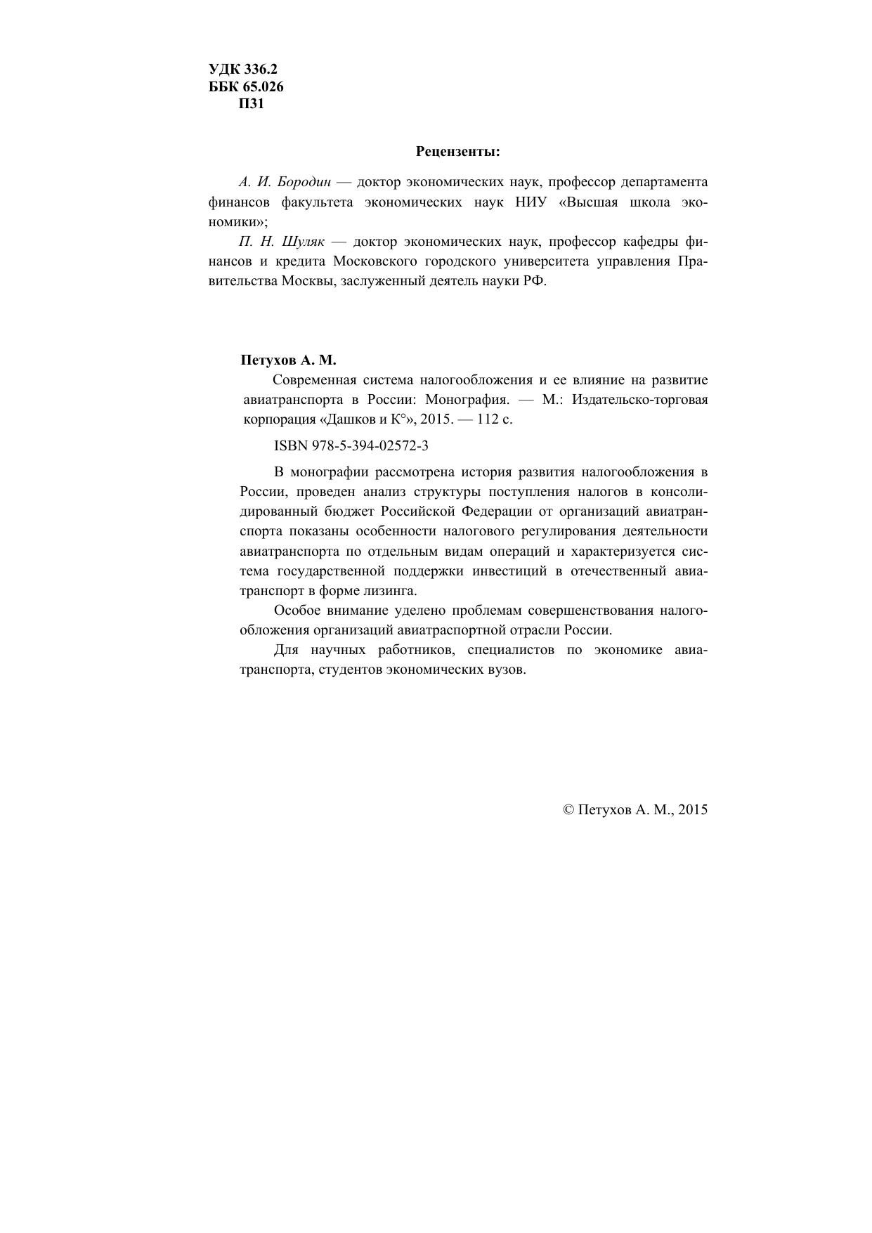 В монографии рассмотрена история развития налогообложения в России, проведен анализ структуры поступления налогов в консолидированный бюджет Российской Федерации от организаций авиатранспорта показаны особенности налогового регулирования деятельности авиатранспорта по отдельным видам операций и характеризуется система государственной поддержки инвестиций в отечественный авиатранспорт в форме лизинга. Особое внимание уделено проблемам совершенствования налогообложения организаций авиатраспортной отрасли России. Для научных работников, специалистов по экономике авиатранспорта, студентов экономических вузов.
