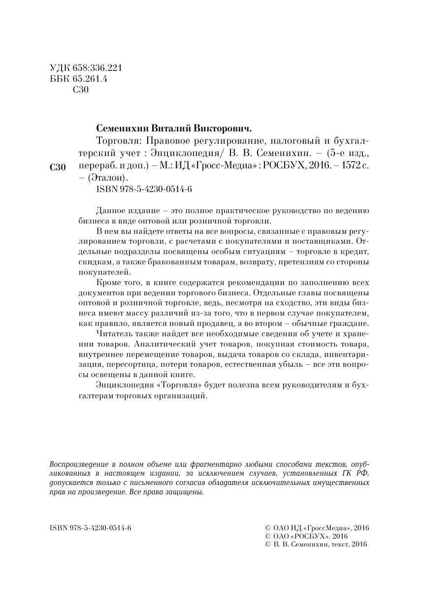 документов при ведении торгового бизнеса. Отдельные главы посвящены оптовой и розничной торговле, ведь, несмотря на сходство, эти виды бизнеса имеют массу различий из-за того, что в первом случае покупателем, как правило, является новый продавец, а во втором – обычные граждане. Читатель также найдет все необходимые сведения об учете и хранении товаров. Аналитический учет товаров, покупная стоимость товара, внутреннее перемещение товаров, выдача товаров со склада, инвентаризация, пересортица, потери товаров, естественная убыль – все эти вопросы освещены в данной книге. Энциклопедия «Торговля» будет полезна всем руководителям и бухгалтерам торговых организаций.