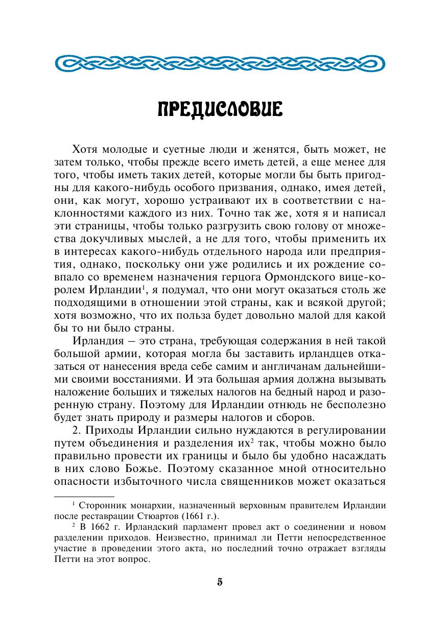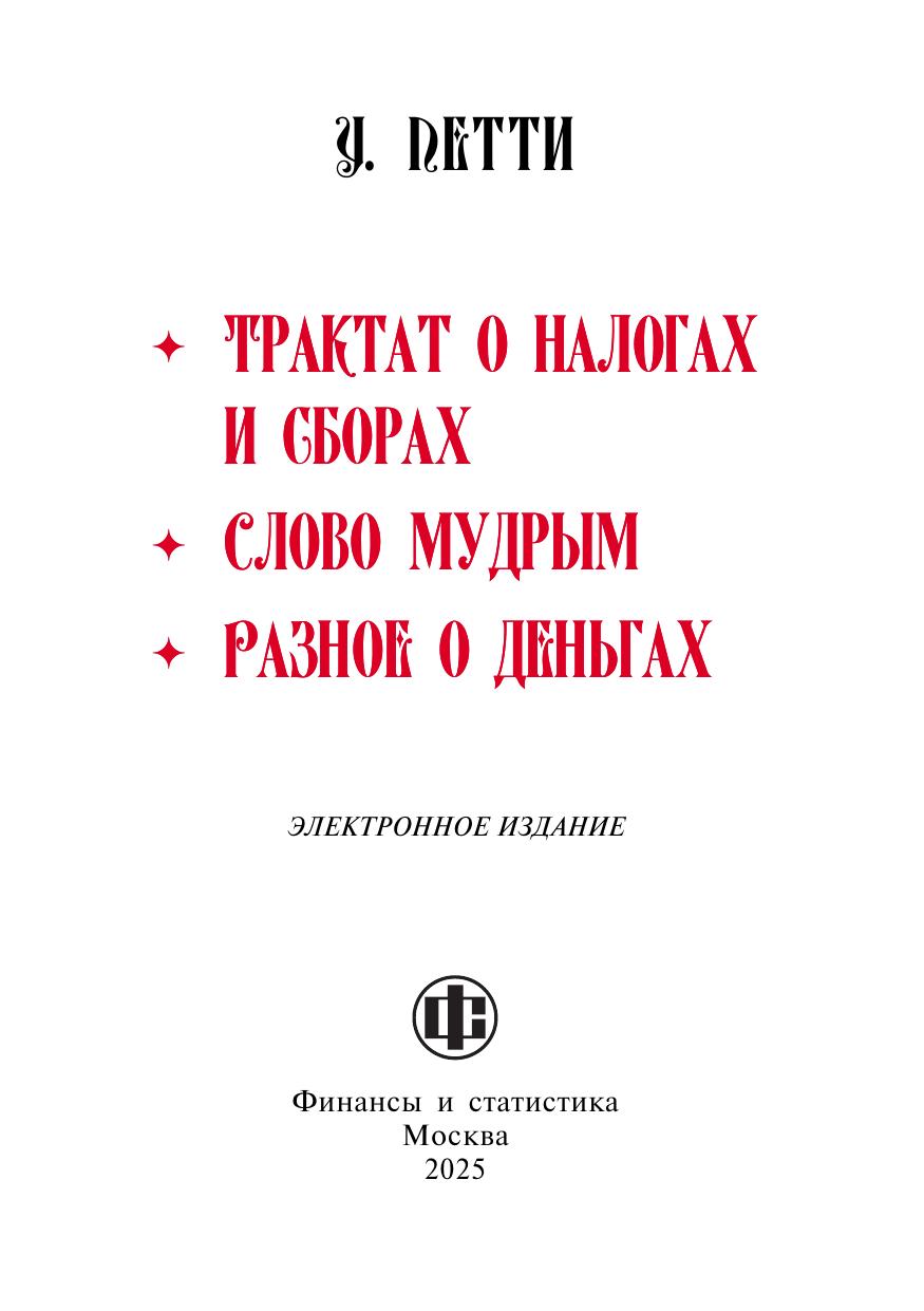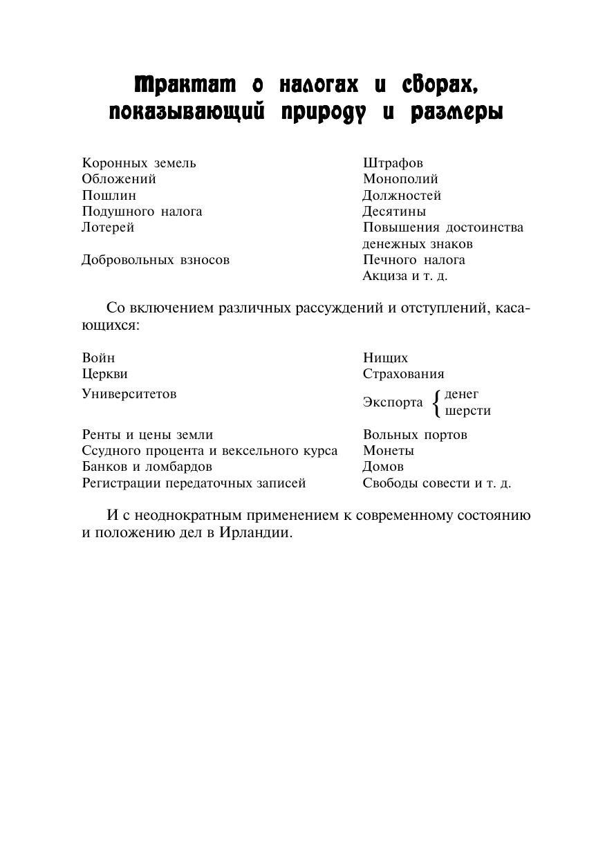 Книга является библиографической редкостью. У. Петти (1623–1687) – известный основоположник классической политэкономии, идеи и оригинальные мысли которого не потеряли актуальность и сегодня. Его работы связаны со становлением и развитием капиталистических производственных отношений. В сборник вошли три его работы, где подробно рассматриваются способы распределения налогов, изучаются деньги и сколько их требуется для движения торговли, изучаются проценты, таможенные пошлины и вольные гавани, монополии и должности, добровольные взносы, подушный налог, лотереи.
