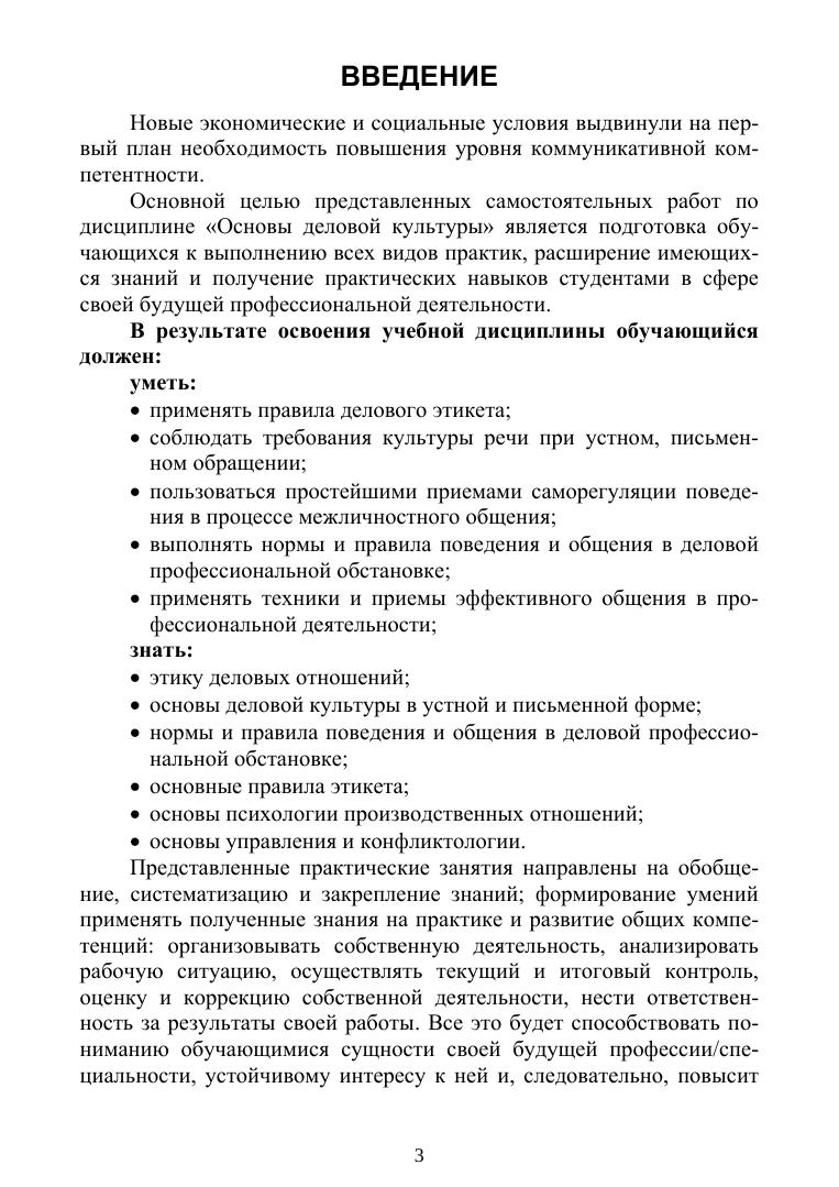 Практикум по дисциплине «Основы деловой культуры» содержит информационные материалы и практические задания для выполнения самостоятельной работы. Информационная часть знакомит обучающихся с этикой деловых отношений, основами деловой культуры в устной и письменной речи, нормами и правилами поведения в деловой среде. Практические занятия направлены на обобщение, систематизацию и закрепление этих знаний и формирование умений применять полученные знания на практике в деловой профессиональной обстановке. Соответствует современным требованиям Федерального государственного образовательного стандарта среднего профессионального образования и профессиональным квалификационным требованиям. Издание предназначено студентам профессиональных образовательных организаций различных направлений подготовки, а также может быть полезно педагогам, преподающим данную дисциплину, и специалистам, чья профессиональная деятельность осуществляется в сфере деловых коммуникаций.