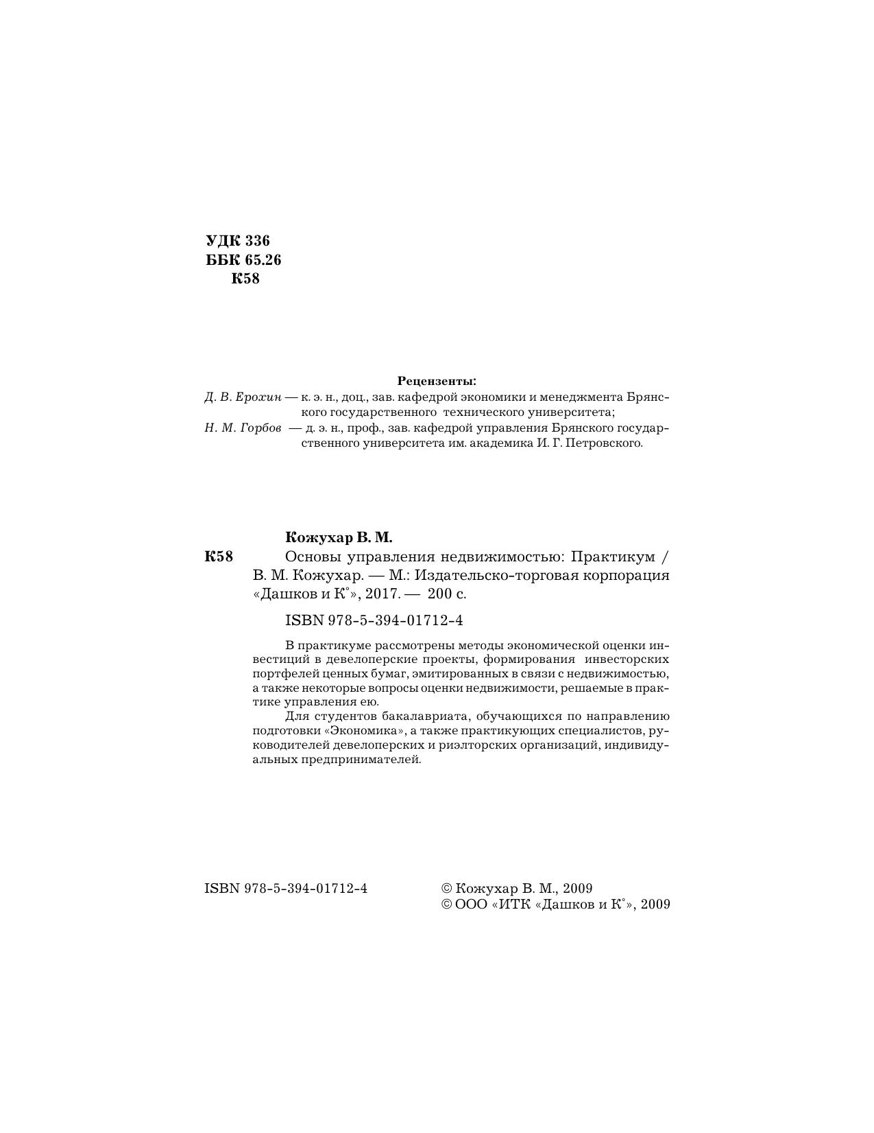 В практикуме рассмотрены методы экономической оценки инвестиций в девелоперские проекты, формирования инвесторских портфелей ценных бумаг, эмитированных в связи с недвижимостью, а также некоторые вопросы оценки недвижимости, решаемые в практике управления ею.
