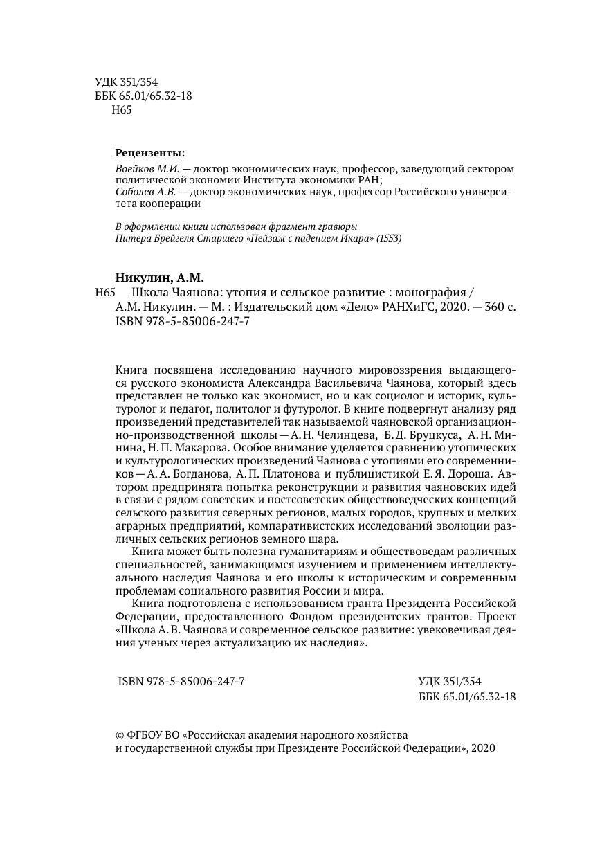 Книга подготовлена с использованием гранта Президента Российской Федерации, предоставленного Фондом президентских грантов. Проект «Школа А. В. Чаянова и современное сельское развитие: увековечивая дея-ния ученых через актуализацию их наследия».