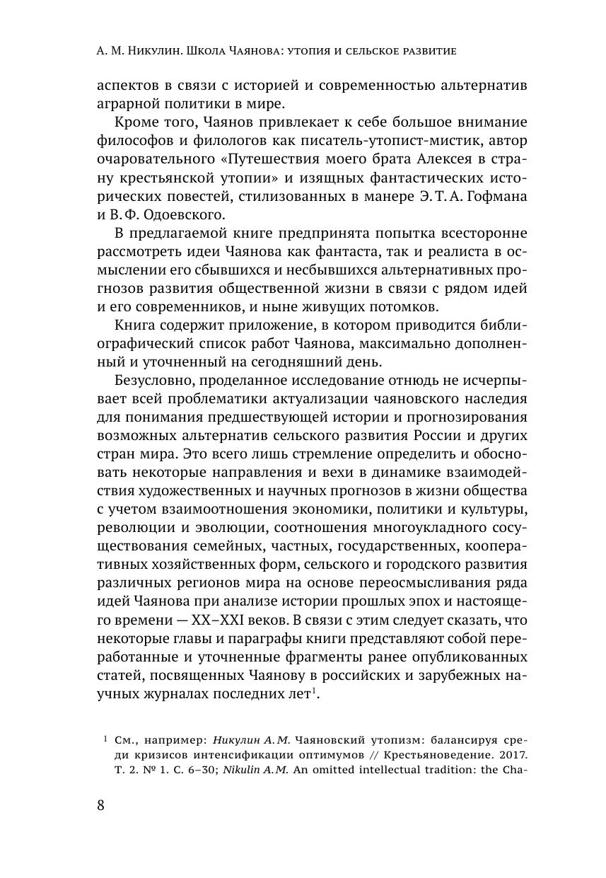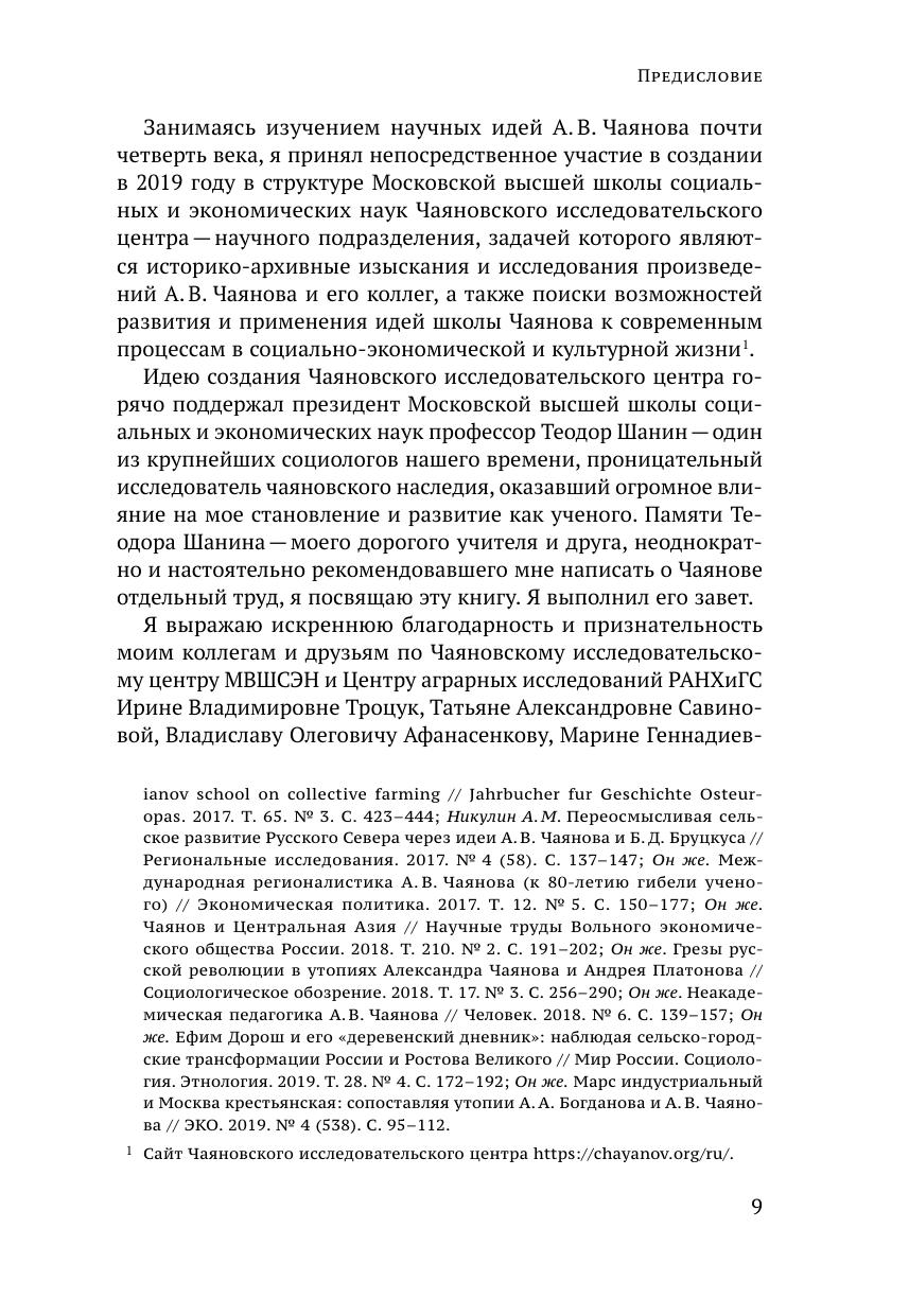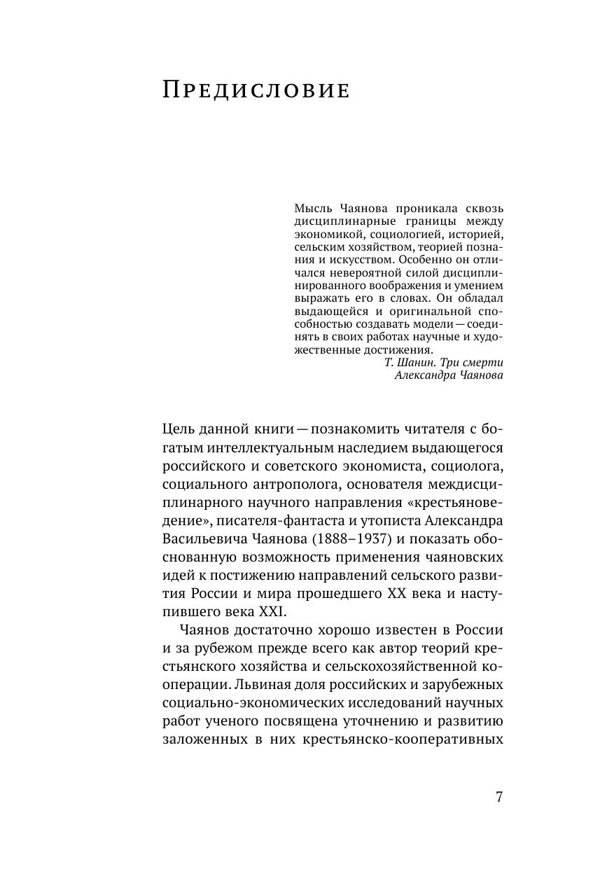 Книга посвящена исследованию научного мировоззрения выдающегося русского экономиста Александра Васильевича Чаянова, который здесь представлен не только как экономист, но и как социолог и историк, культуролог и педагог, политолог и футуролог. В книге подвергнут анализу ряд произведений представителей так называемой чаяновской организационно-производственной школы — А. Н. Челинцева, Б. Д. Бруцкуса, А. Н. Минина, Н. П. Макарова. Особое внимание уделяется сравнению утопических и культурологических произведений Чаянова с утопиями его современников — А. А. Богданова, А. П. Платонова и публицистикой Е. Я. Дороша. Автором предпринята попытка реконструкции и развития чаяновских идей в связи с рядом советских и постсоветских обществоведческих концепций сельского развития северных регионов, малых городов, крупных и мелких аграрных предприятий, компаративистских исследований эволюции различных сельских регионов земного шара.