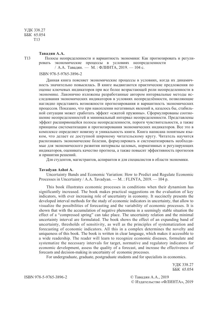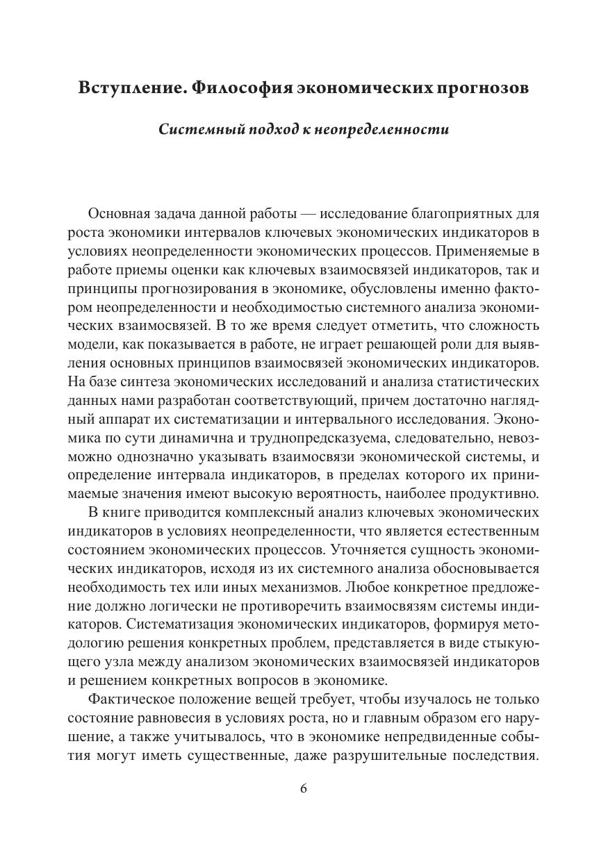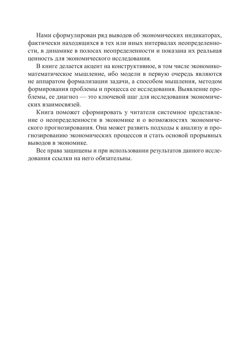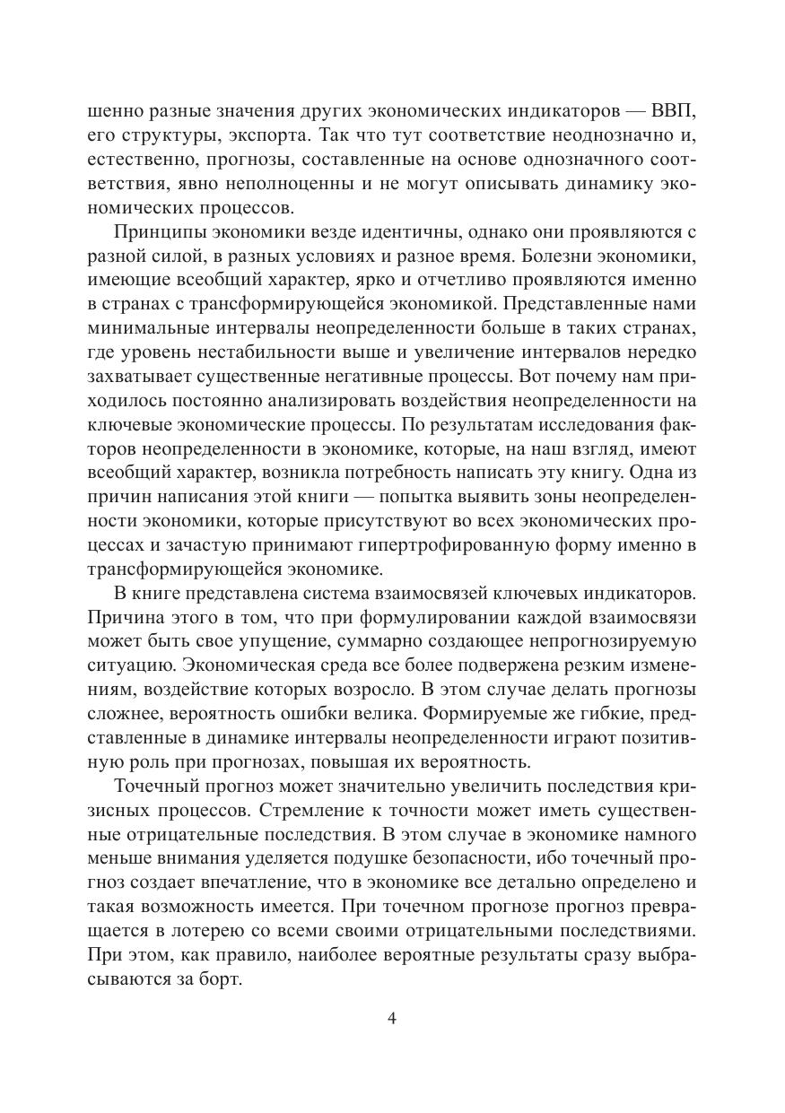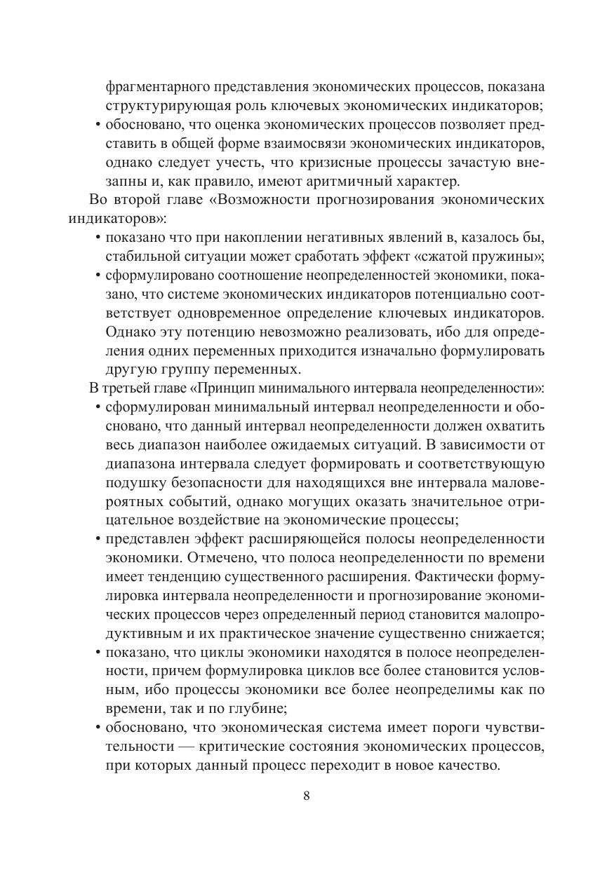Данная книга поясняет экономические процессы в условиях, когда их динамичность значительно повысилась. В книге выдвигаются практические предложения по оценке ключевых индикаторов при все более возрастающей роли неопределенности в экономике. Лаконично изложены разработанные автором интервальные методы исследования экономических индикаторов в условиях неопределённости, позволяющиенаглядно представить возможности прогнозирования и вариантность экономических процессов. Показано, что при накоплении негативных явлений в, казалось бы, стабильной ситуации может сработать эффект «сжатой пружины». Сформулированы соотношение неопределенностей и минимальный интервал неопределенности. Представлены эффект расширяющейся полосы неопределенности, пороги чувствительности, а также принципы систематизации и прогнозирования экономических индикаторов. Все это в комплексе определяет новизну и уникальность книги. Книга написана понятным языком, что делает ее доступной широкому читательскому кругу. Читатель научится распознавать экономические болезни, формулировать и систематизировать необходимые для экономического развития интервалы целевых, нормативных и регулирующих индикаторов, оценивать качество прогноза, а также повысит эффективность прогнозов и принятия решений.