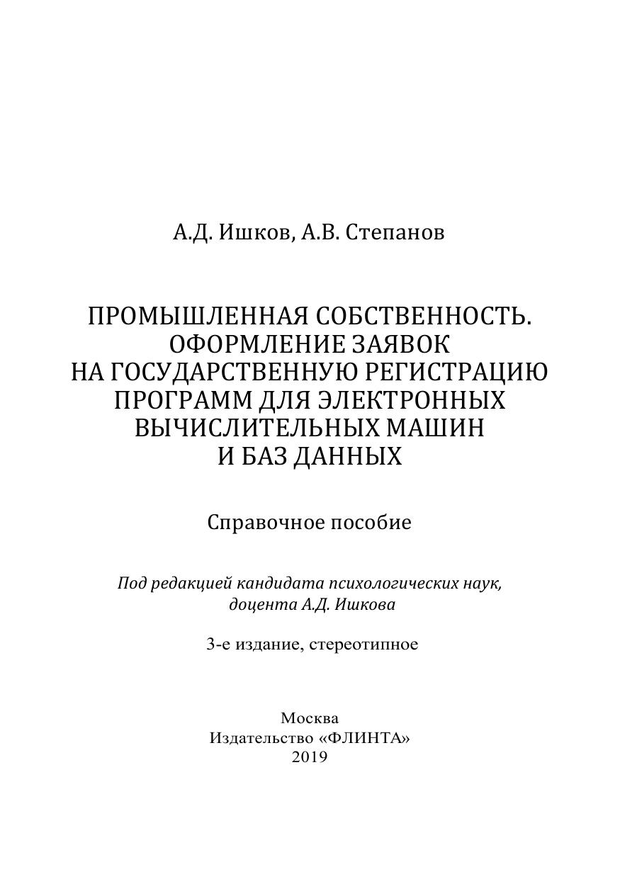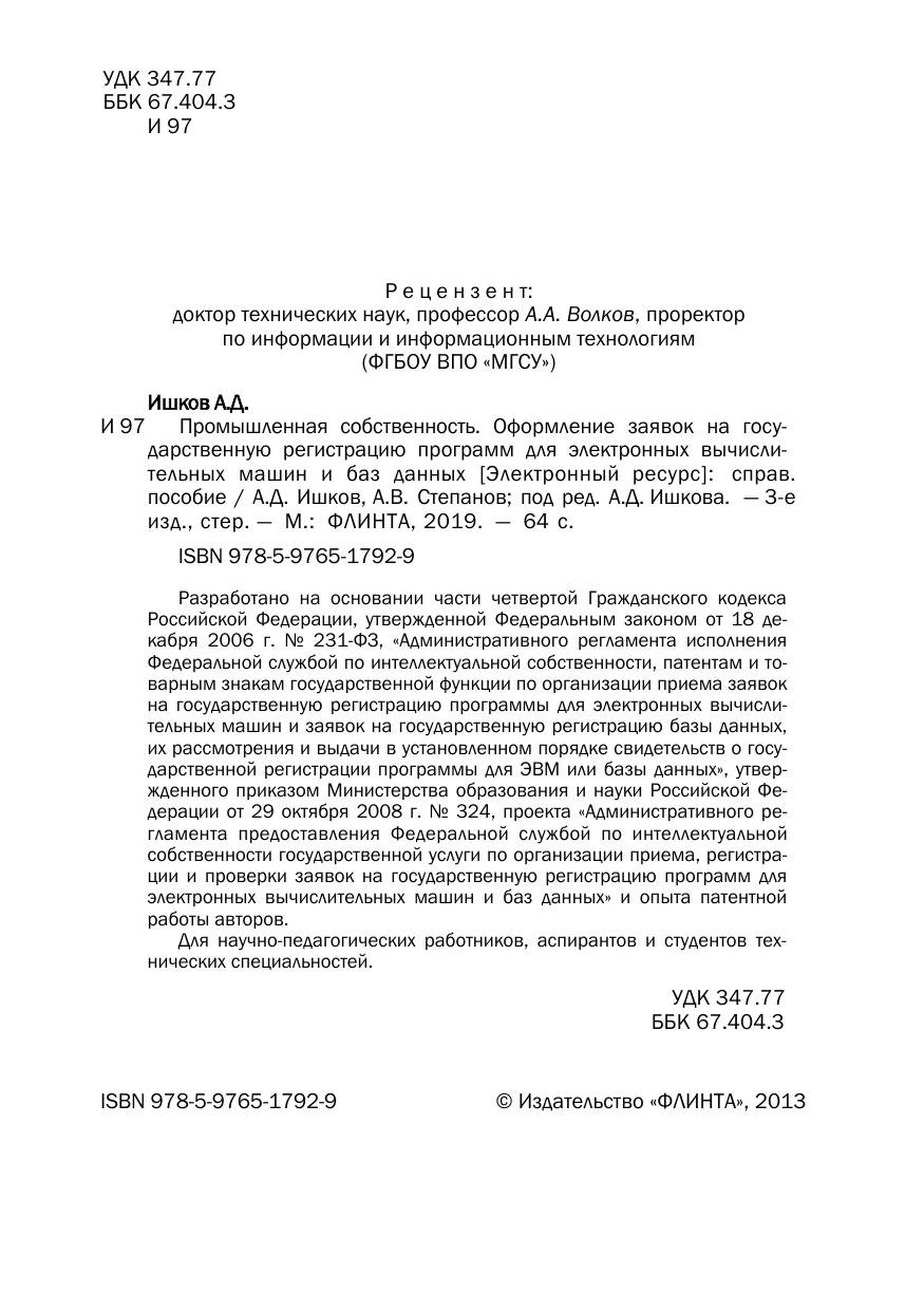 собственности государственной услуги по организации приема, регистрации и проверки заявок на государственную регистрацию программ для электронных вычислительных машин и баз данных» и опыта патентной работы авторов. Для научно-педагогических работников, аспирантов и студентов технических специальностей.