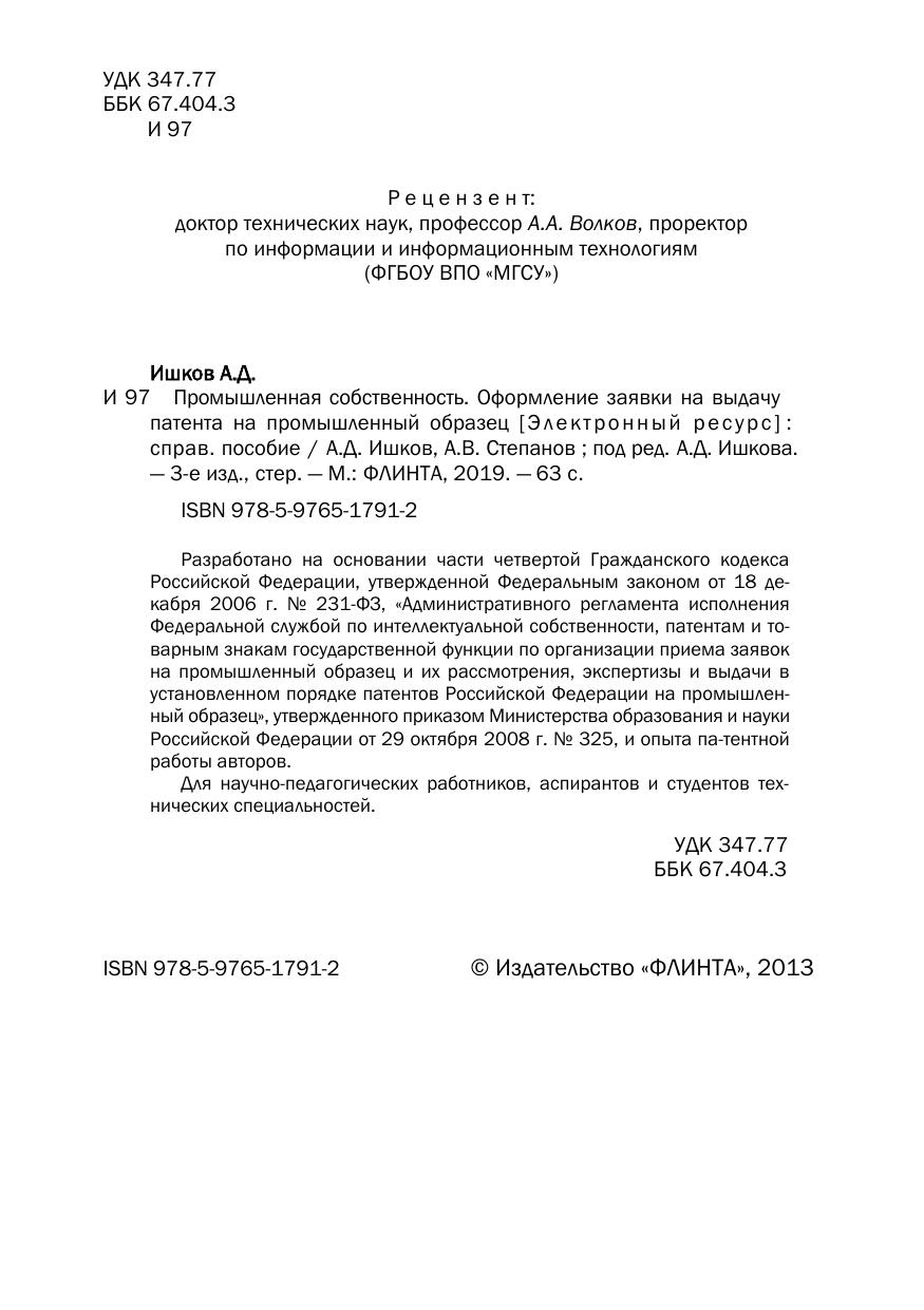 установленном порядке патентов Российской Федерации на промышленный образец», утвержденного приказом Министерства образования и науки Российской Федерации от 29 октября 2008 г. № 325, и опыта патентной работы авторов. Для научно-педагогических работников, аспирантов и студентов технических специальностей.