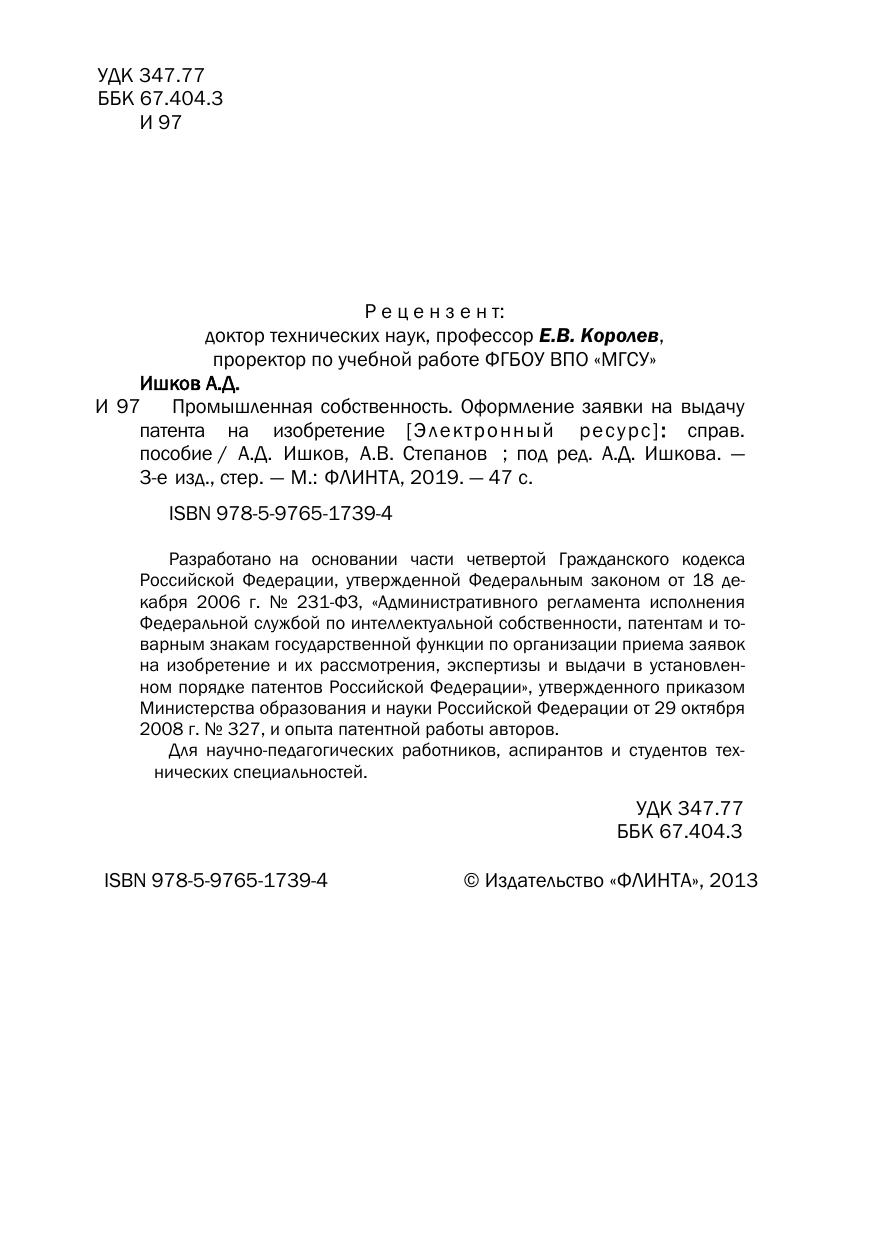 Федеральной службой по интеллектуальной собственности, патентам и товарным знакам государственной функции по организации приема заявок на изобретение и их рассмотрения, экспертизы и выдачи в установленном порядке патентов Российской Федерации», утвержденного приказом Министерства образования и науки Российской Федерации от 29 октября 2008 г. № 327, и опыта патентной работы авторов. Для научно-педагогических работников, аспирантов и студентов технических специальностей.