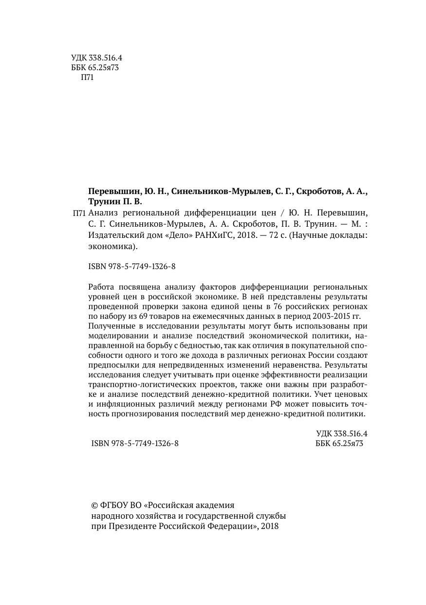 Работа посвящена анализу факторов дифференциации региональных уровней цен в российской экономике. В ней представлены результаты проведенной проверки закона единой цены в 76 российских регионах по набору из 69 товаров на ежемесячных данных в период 2003-2015 гг. Полученные в исследовании результаты могут быть использованы при моделировании и анализе последствий экономической политики, направленной на борьбу с бедностью, так как отличия в покупательной способности одного и того же дохода в различных регионах России создают предпосылки для непредвиденных изменений неравенства. Результаты исследования следует учитывать при оценке эффективности реализации транспортно-логистических проектов, также они важны при разработке и анализе последствий денежно-кредитной политики. Учет ценовых и инфляционных различий между регионами РФ может повысить точность прогнозирования последствий мер денежно-кредитной политики.