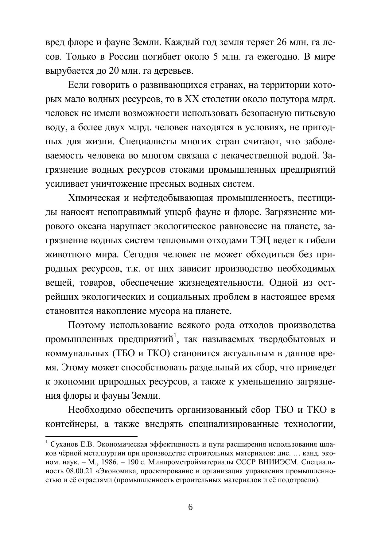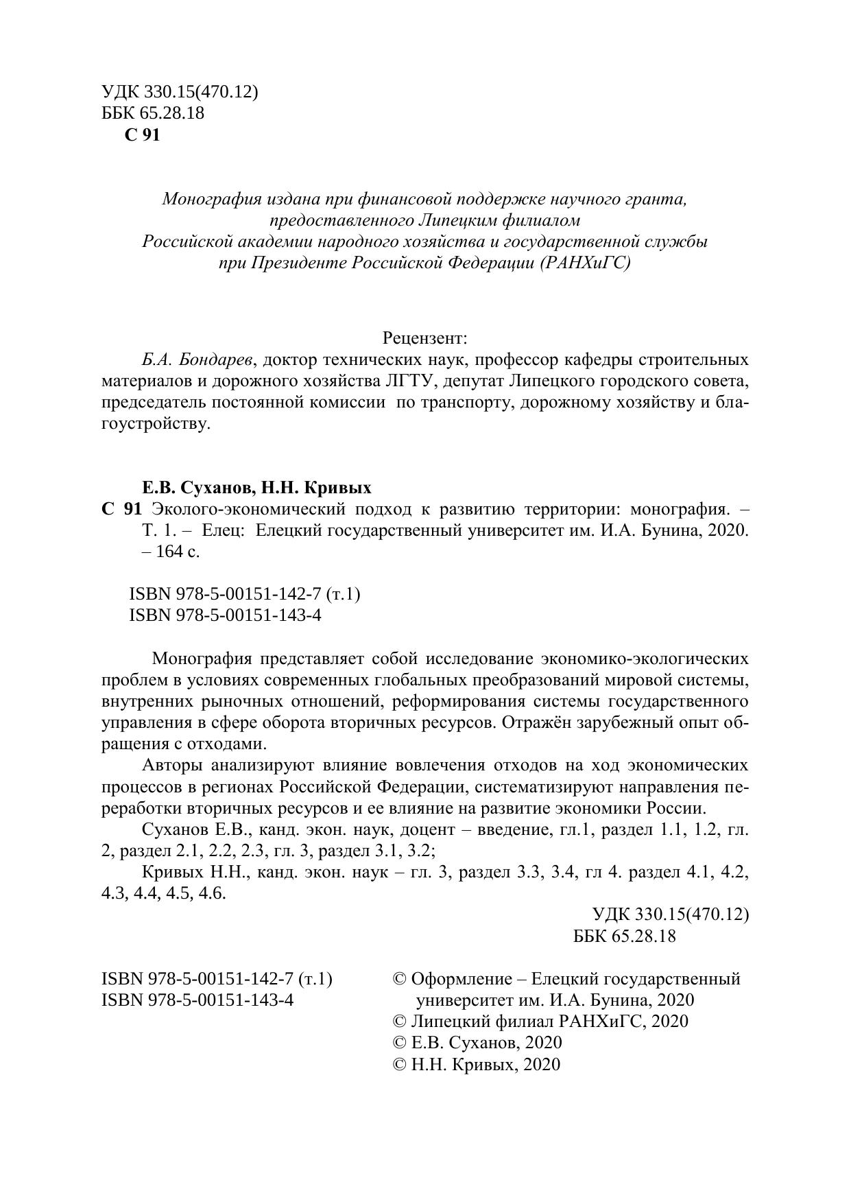 Монография представляет собой исследование экономико-экологических проблем в условиях современных глобальных преобразований мировой системы, внутренних рыночных отношений, реформирования системы государственного управления в сфере оборота вторичных ресурсов. Отражѐн зарубежный опыт об-ращения с отходами. Авторы анализируют влияние вовлечения отходов на ход экономических процессов в регионах Российской Федерации, систематизируют направления пе-реработки вторичных ресурсов и ее влияние на развитие экономики России. Суханов Е.В., канд. экон. наук, доцент – введение, гл.1, раздел 1.1, 1.2, гл. 2, раздел 2.1, 2.2, 2.3, гл. 3, раздел 3.1, 3.2; Кривых Н.Н., канд. экон. наук – гл. 3, раздел 3.3, 3.4, гл 4. раздел 4.1, 4.2, 4.3, 4.4, 4.5, 4.6.
