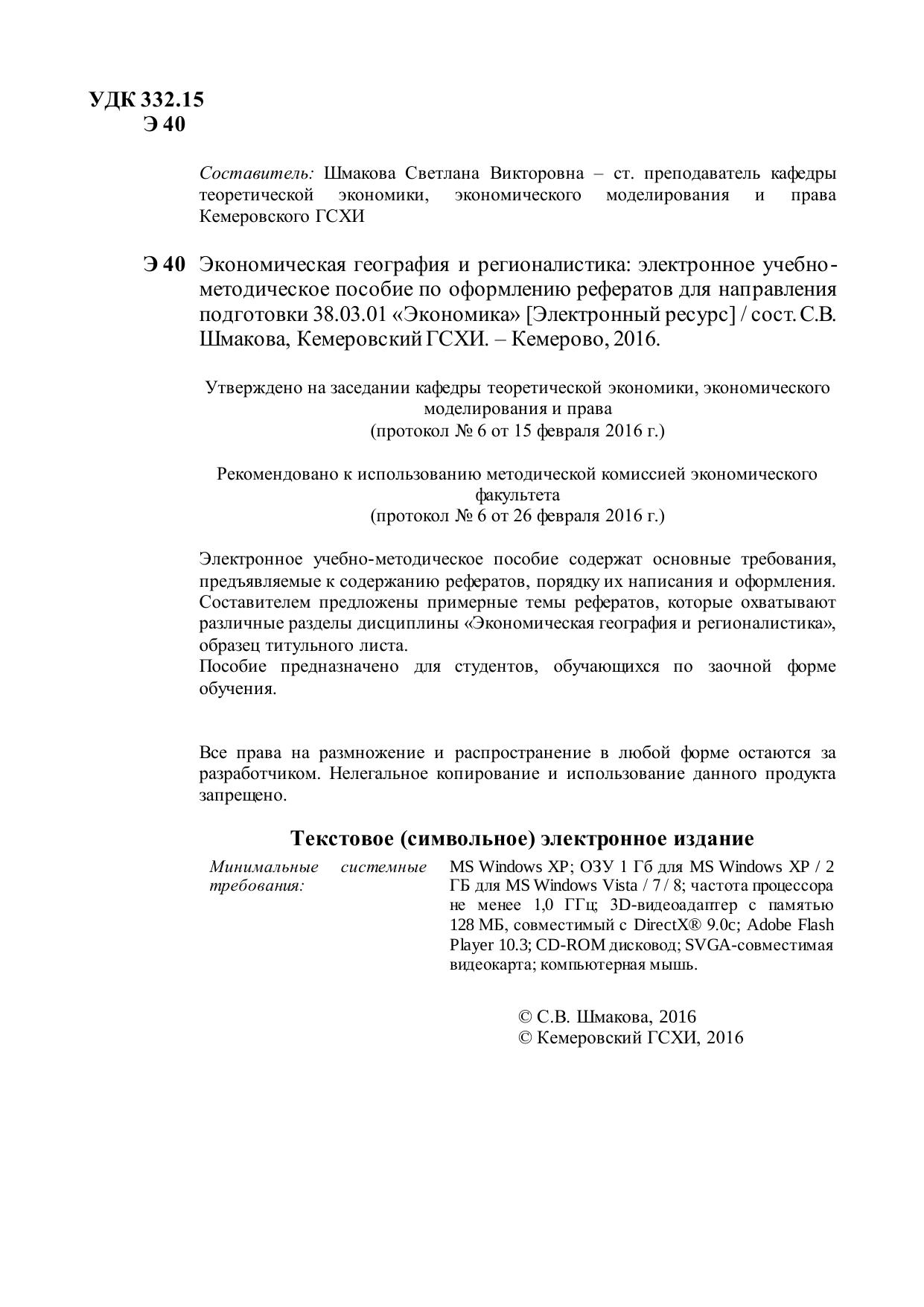 Электронное учебно-методическое пособие содержат основные требования, предъявляемые к содержанию рефератов, порядку их написания и оформления. Составителем предложены примерные темы рефератов, которые охватывают различные разделы дисциплины «Экономическая география и регионалистика», образец титульного листа.