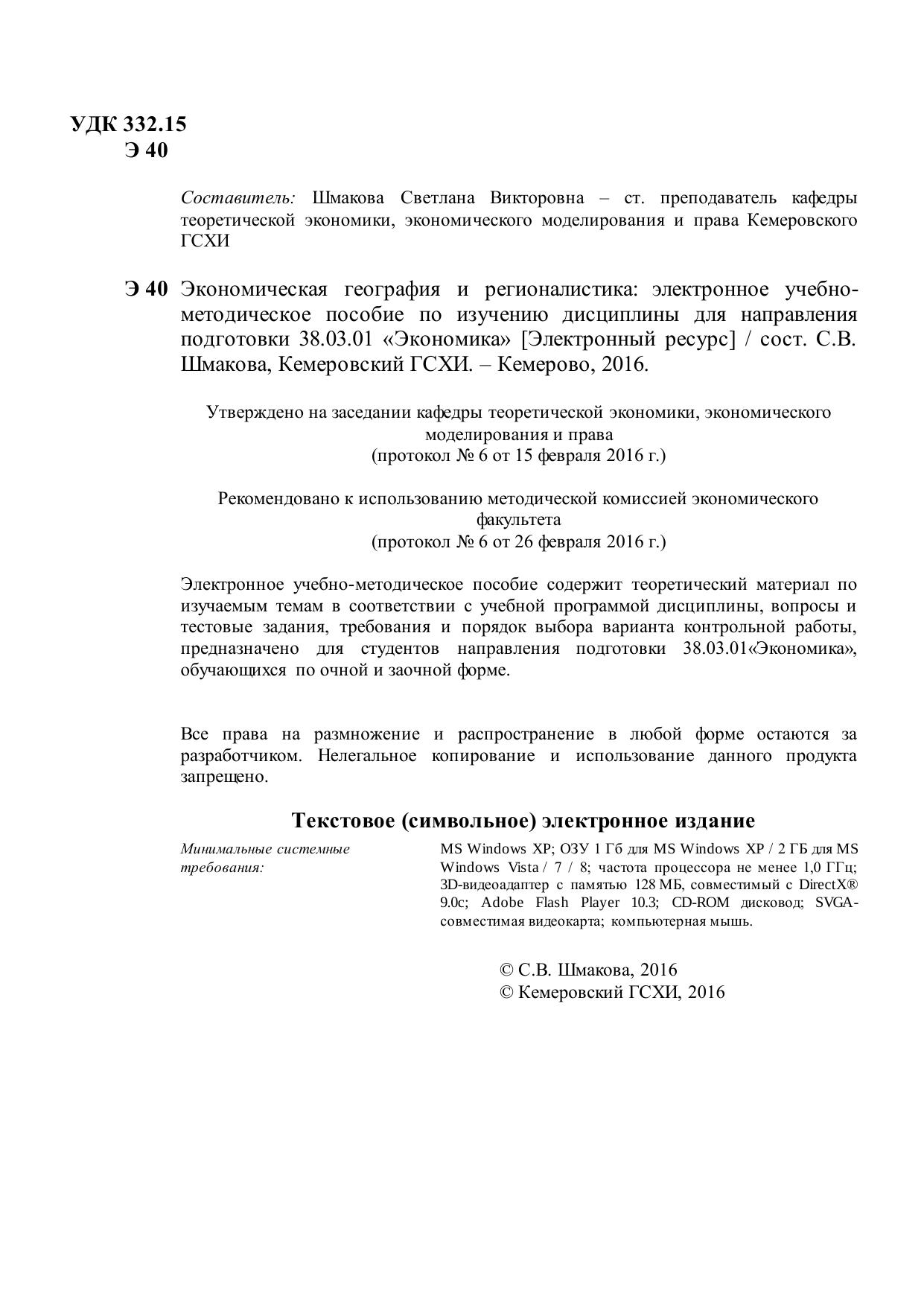 Электронное учебно-методическое пособие содержит теоретический материал по изучаемым темам в соответствии с учебной программой дисциплины, вопросы и тестовые задания, требования и порядок выбора варианта контрольной работы, предназначено для студентов направления подготовки 38.03.01«Экономика», обучающихся по очной и заочной форме.