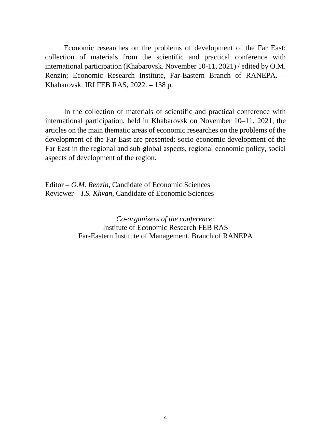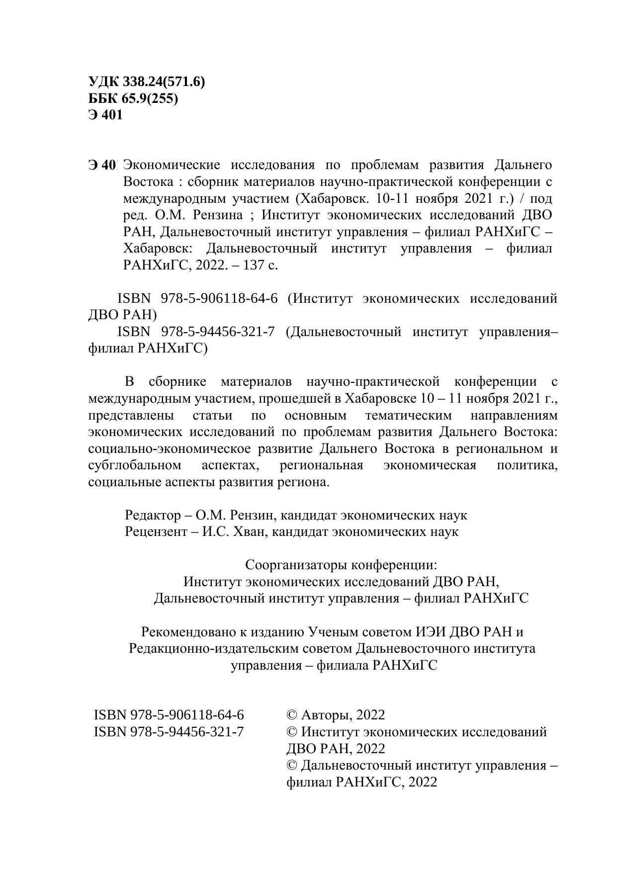 Экономические исследования по проблемам развития Дальнего Востока: сборник материалов научно-практической конференции с международным участием (Хабаровск. 10-11 ноября 2021 г.)