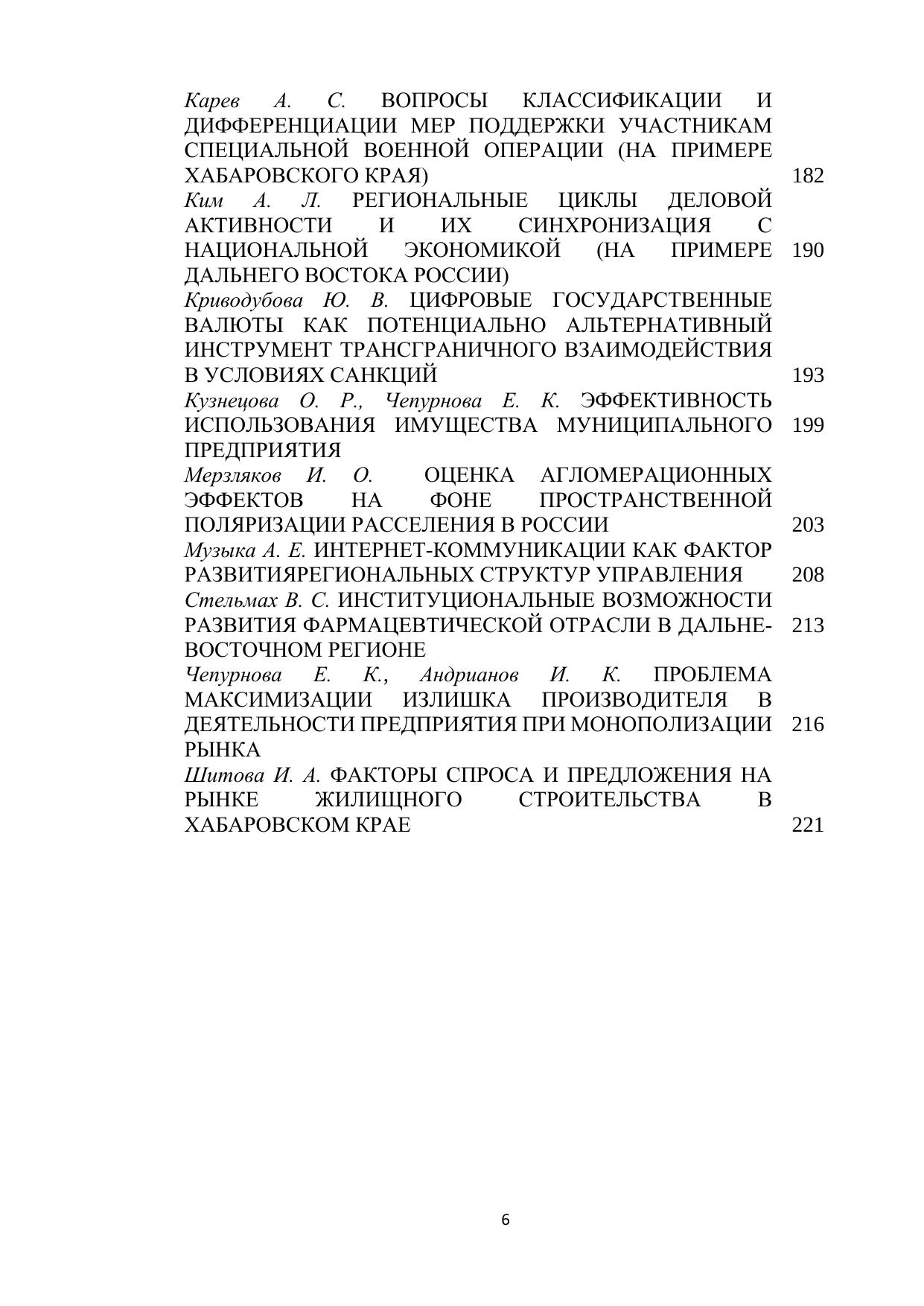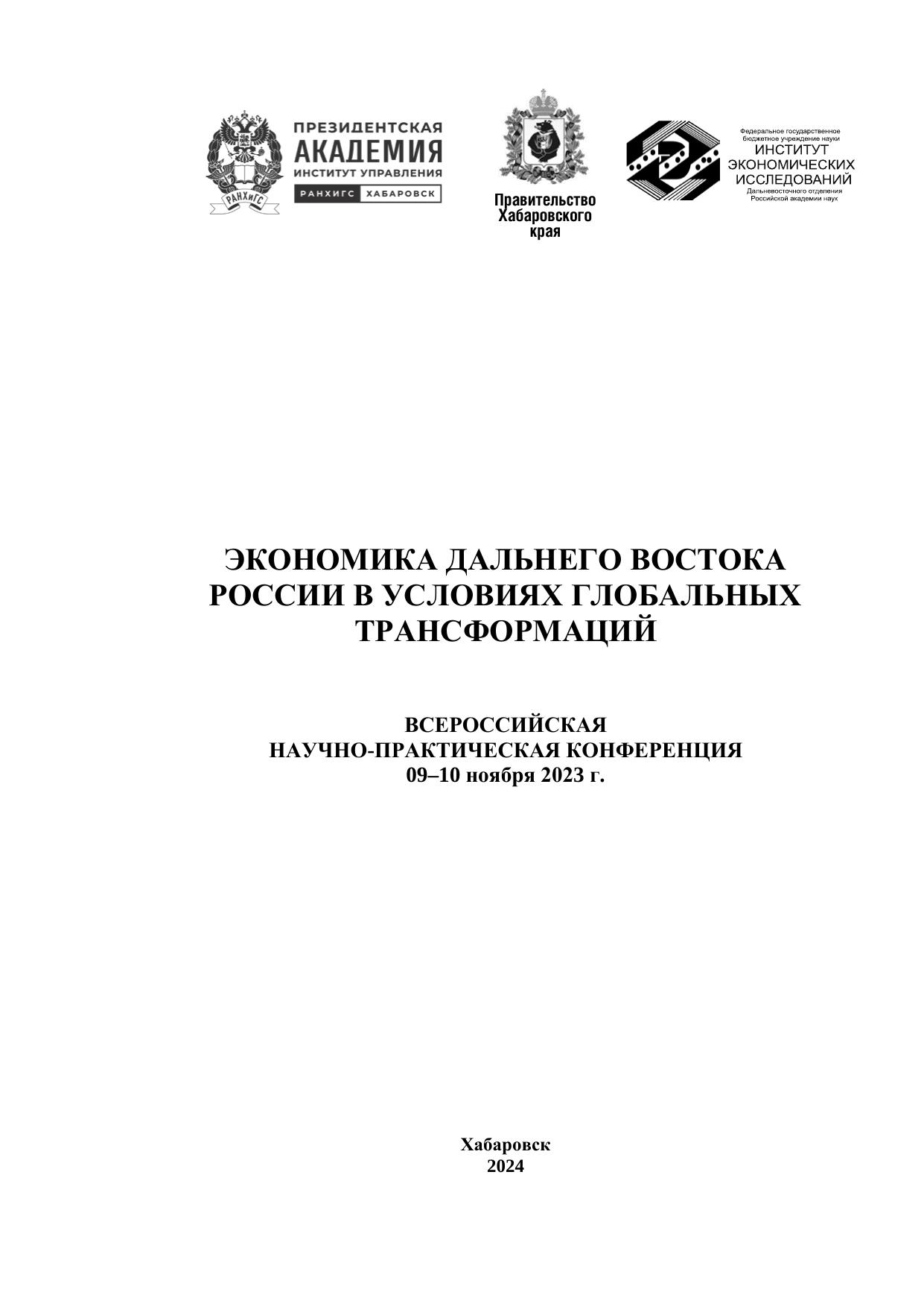 В сборник включены материалы Всероссийской научнопрактической конференции «Экономика Дальнего Востока России в условиях глобальных трансформаций», которая состоялась 09–10 ноября 2023 г. в г. Хабаровске. Материалы научно-практической конференции предназначены для преподавателей, аспирантов, студентов и всех, кто интересуется вопросами экономики Дальнего Востока.