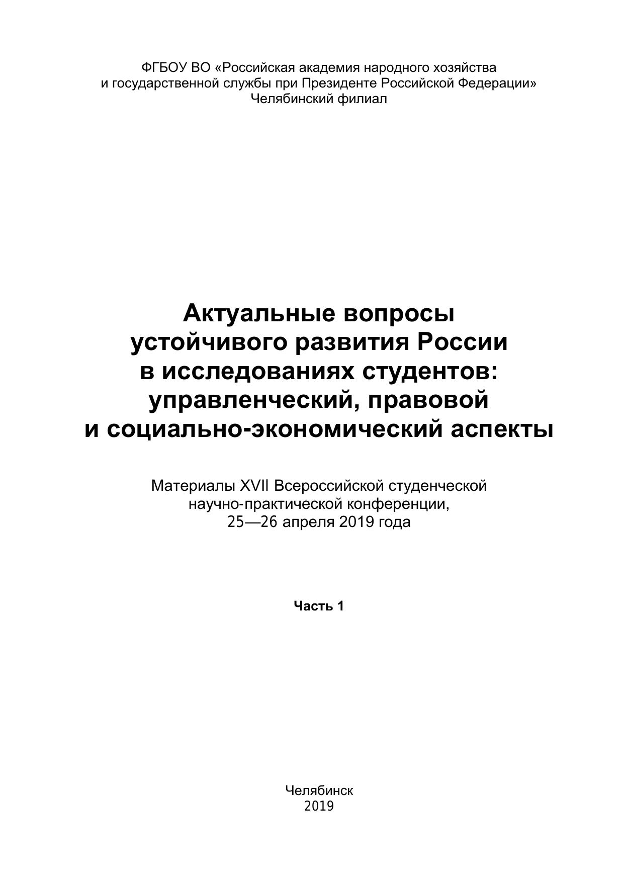 Актуальные вопросы развития России в исследованиях студентов: управленческий, правовой и социально-экономический аспекты: Материалы XVII Всероссийской студенческой научно-практической конференции, 25-26 апреля 2019 года: в 2 ч. Ч. 1