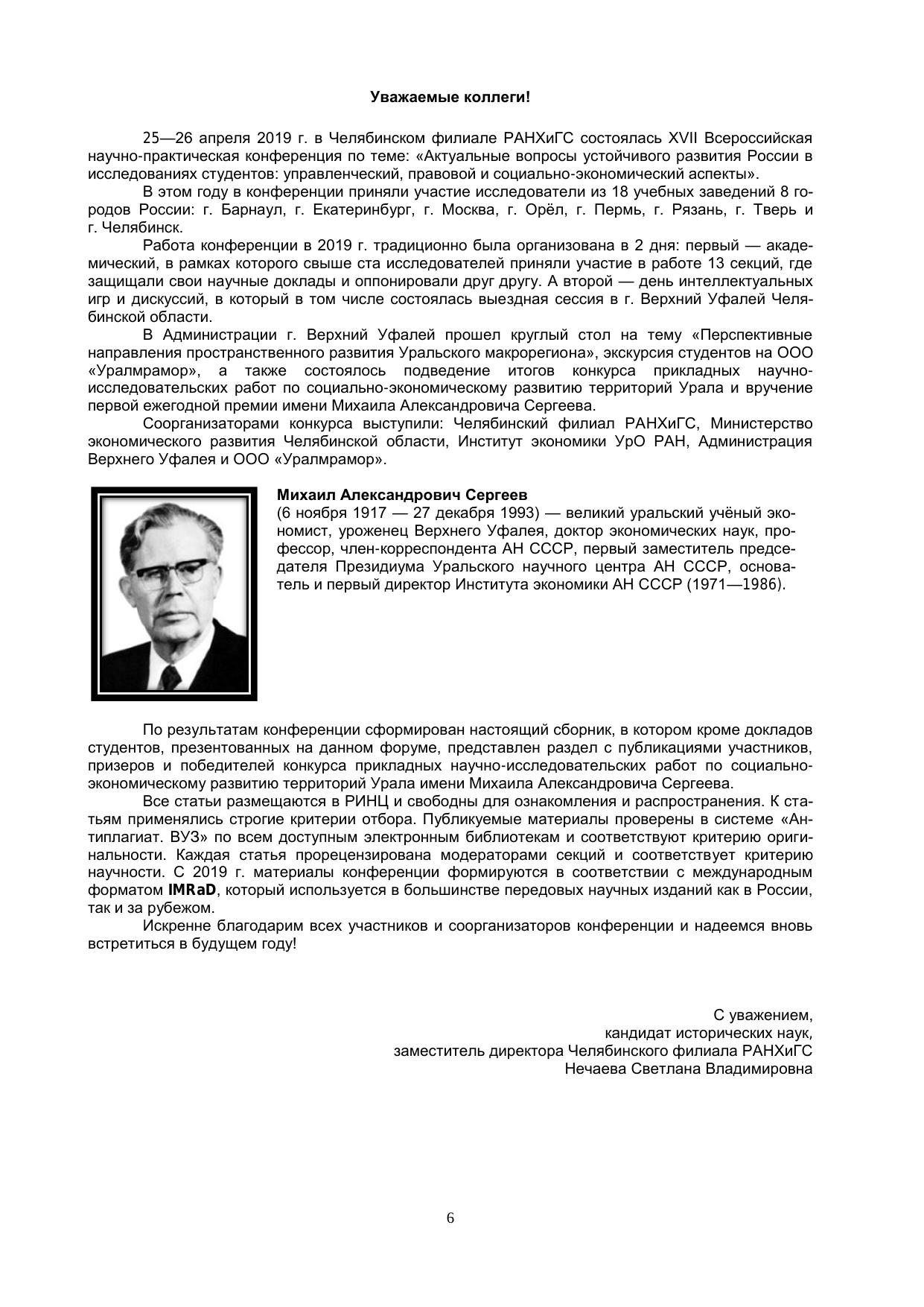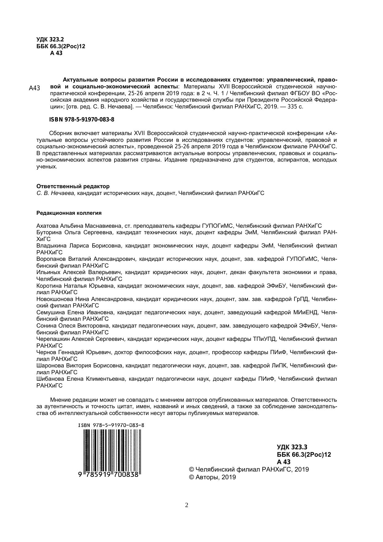Сборник включает материалы XVII Всероссийской студенческой научно-практической конференции «Ак-туальные вопросы устойчивого развития России в исследованиях студентов: управленческий, правовой и социально-экономический аспекты», проведенной 25-26 апреля 2019 года в Челябинском филиале РАНХиГС. В представленных материалах рассматриваются актуальные вопросы управленческих, правовых и социаль-но-экономических аспектов развития страны. Издание предназначено для студентов, аспирантов, молодых ученых.