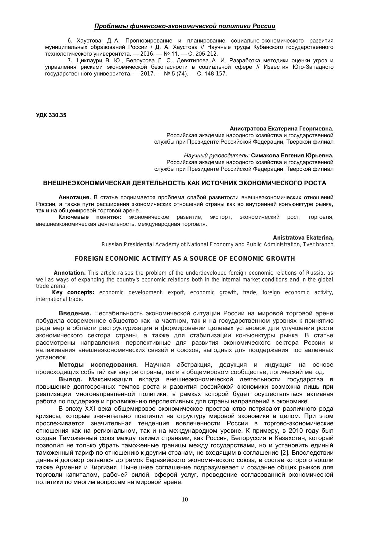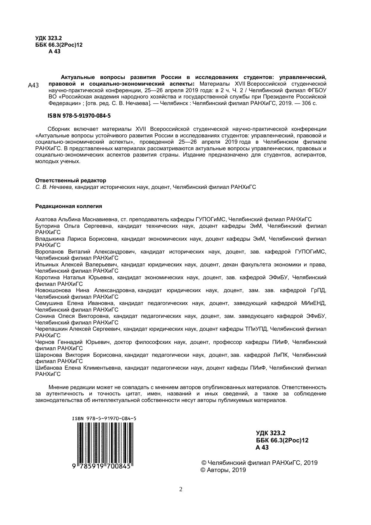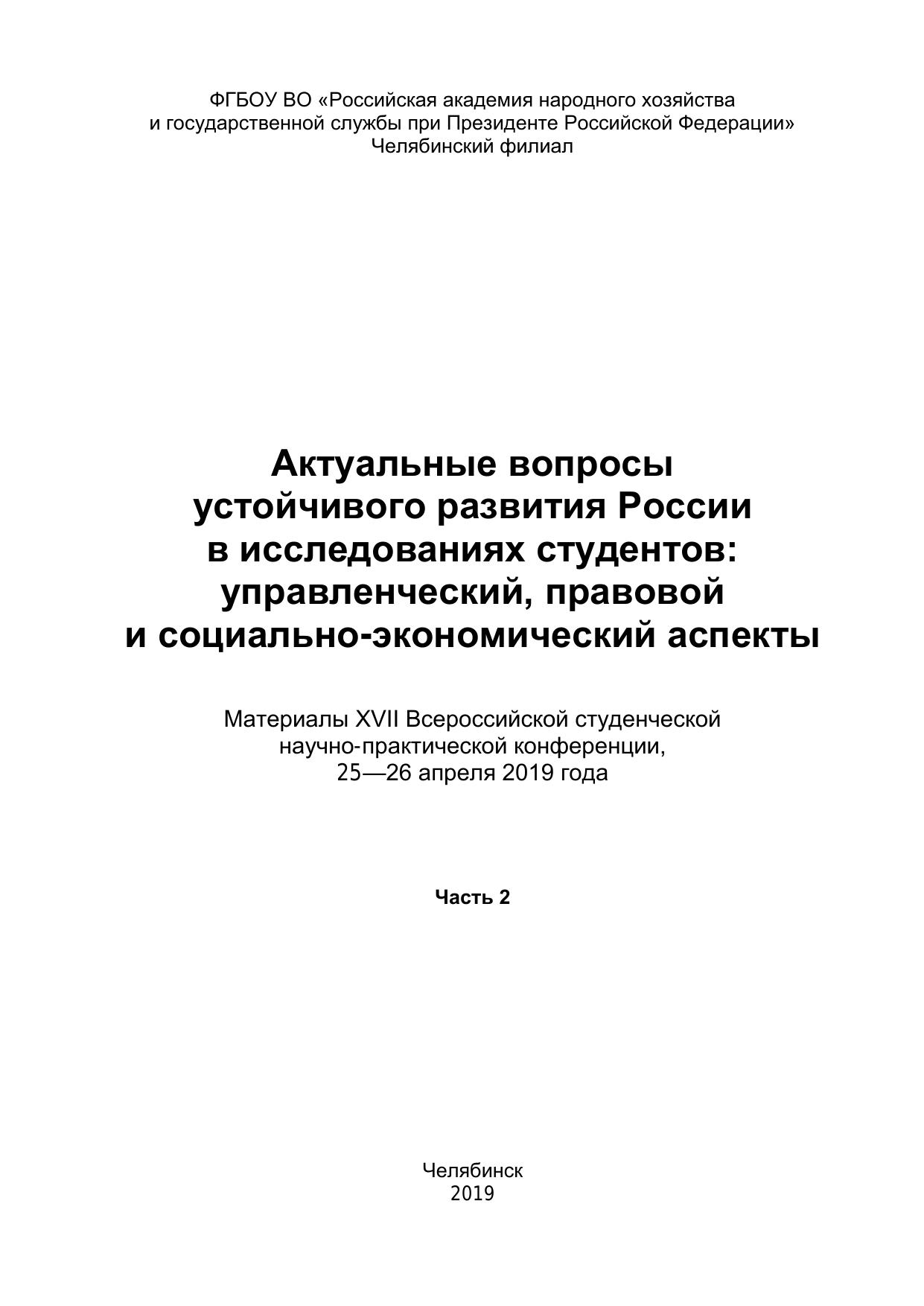 Актуальные вопросы развития России в исследованиях студентов: управленческий, правовой и социально-экономический аспекты: Материалы XVII Всероссийской студенческой научно-практической конференции, 25—26 апреля 2019 года: в 2 ч. Ч. 2