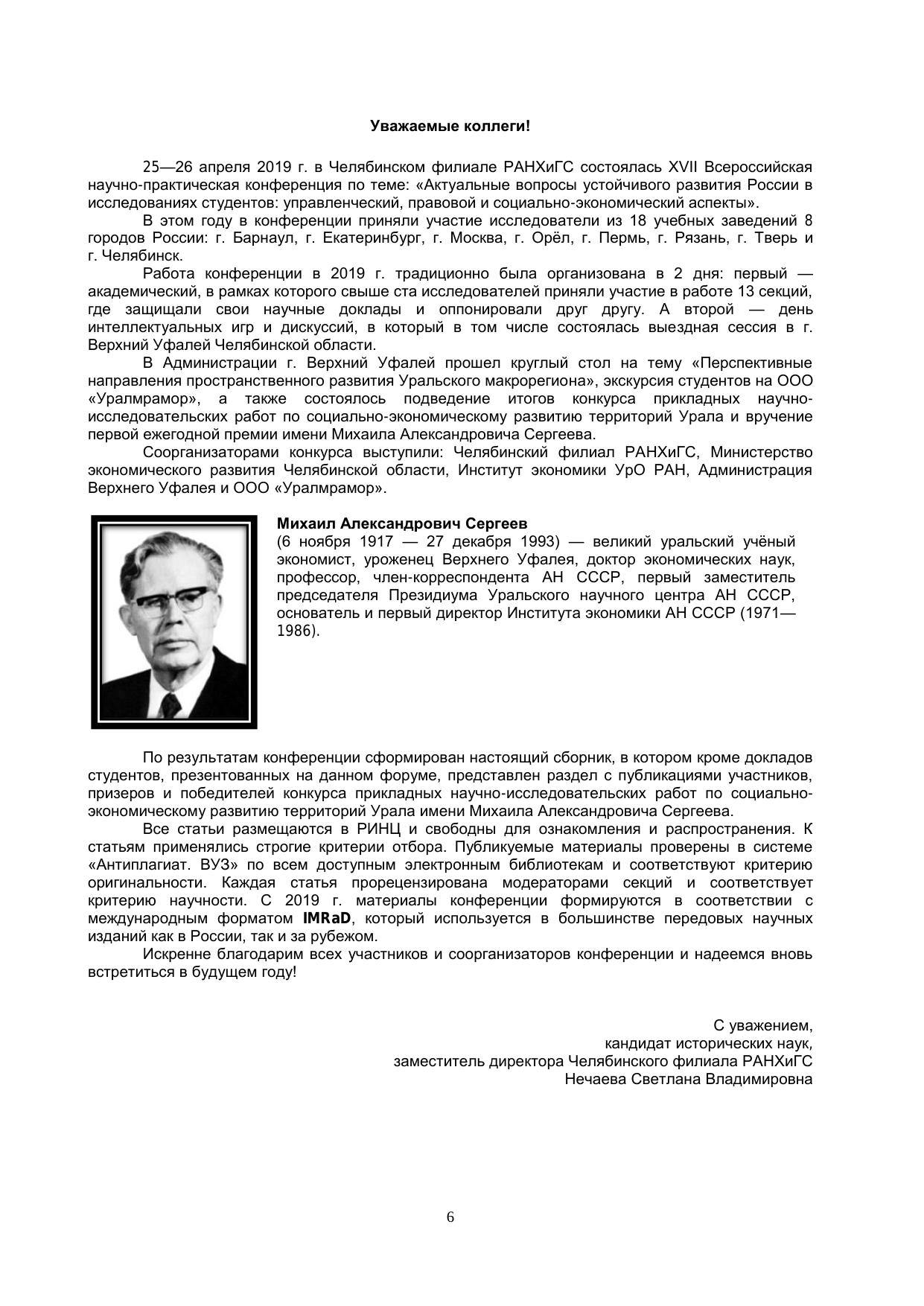 Сборник включает материалы XVII Всероссийской студенческой научно-практической конференции «Актуальные вопросы устойчивого развития России в исследованиях студентов: управленческий, правовой и социально-экономический аспекты», проведенной 25—26 апреля 2019 года в Челябинском филиале РАНХиГС. В представленных материалах рассматриваются актуальные вопросы управленческих, правовых и социально-экономических аспектов развития страны. Издание предназначено для студентов, аспирантов, молодых ученых.